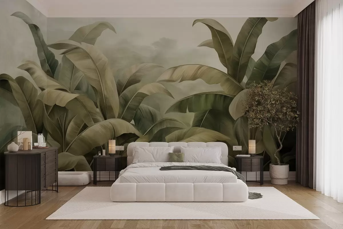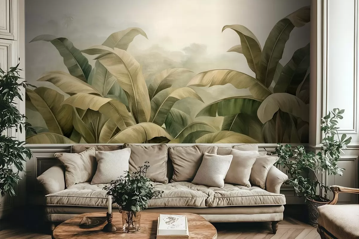 Fotobehang Getextureerd, dichtbegroeid jungle-landschap met grote bananenbladeren in gedempte groene en beige tinten N° w09613