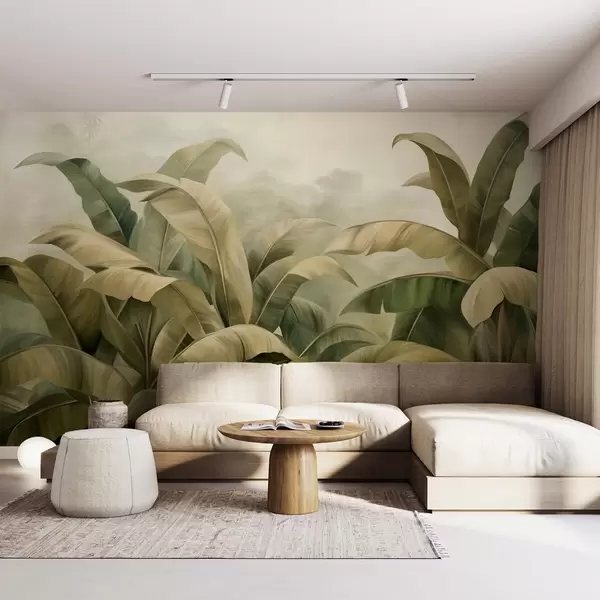 Fotobehang Getextureerd, dichtbegroeid jungle-landschap met grote bananenbladeren in gedempte groene en beige tinten N° w09613