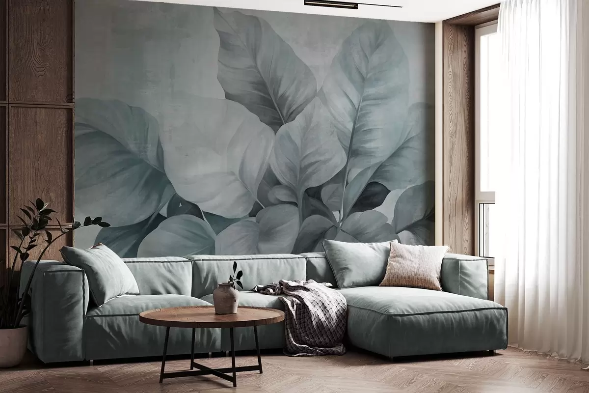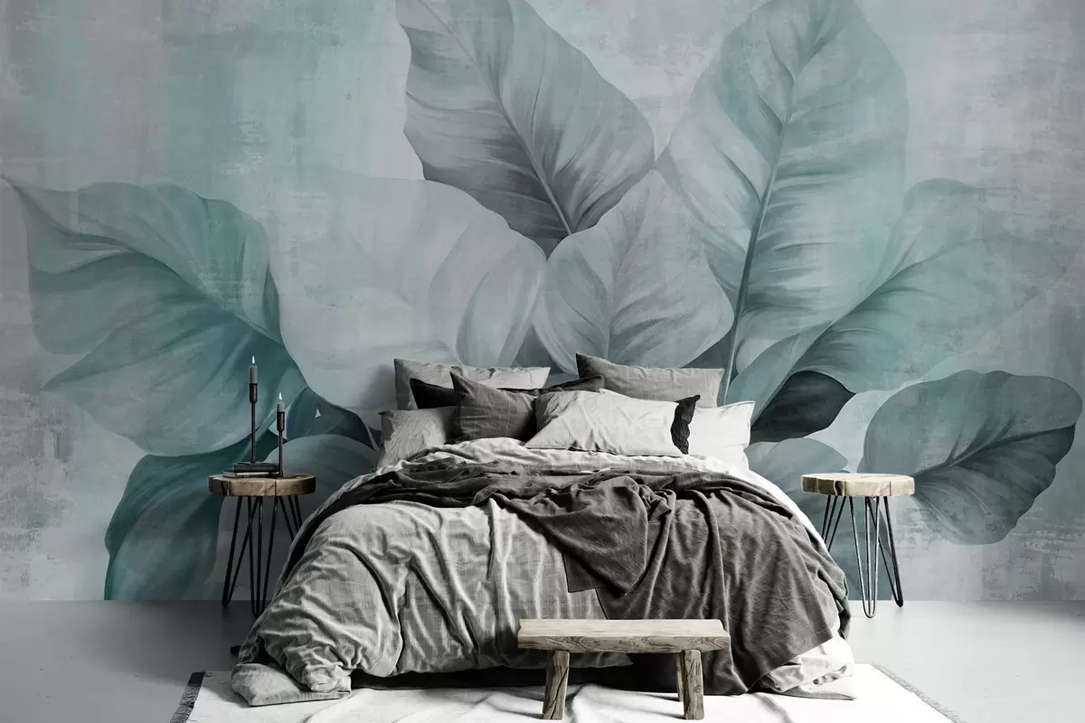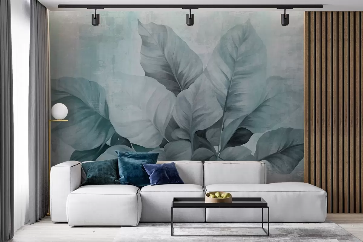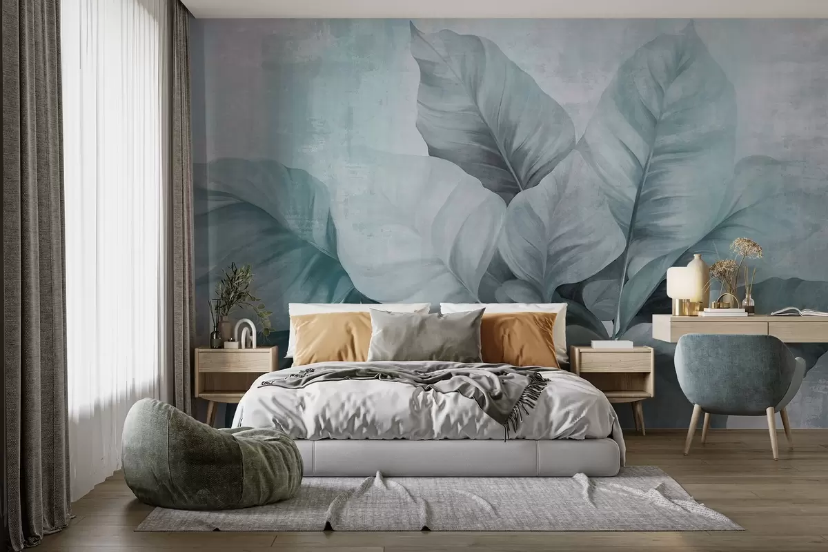 Fotobehang Textuurverf imitatie van grote, lichtblauwe bladeren tegen een neutrale achtergrond met subtiele penseelstreken N° w09614v2