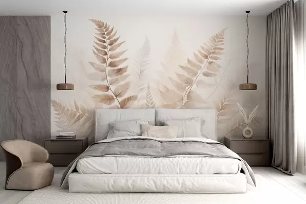 Fotobehang Getextureerde gedroogde varenbladeren in verschillende bruintinten, met een zachte, lichte achtergrond in aquarelstijl. N° w09615