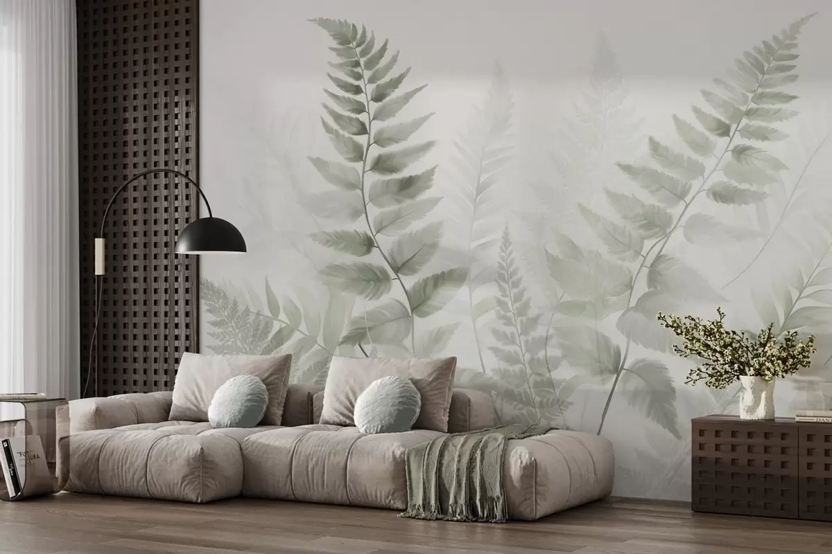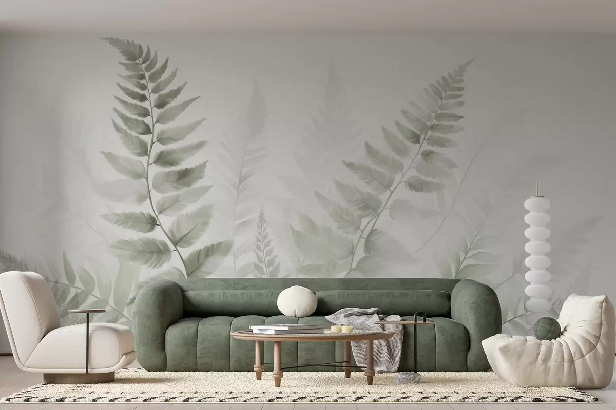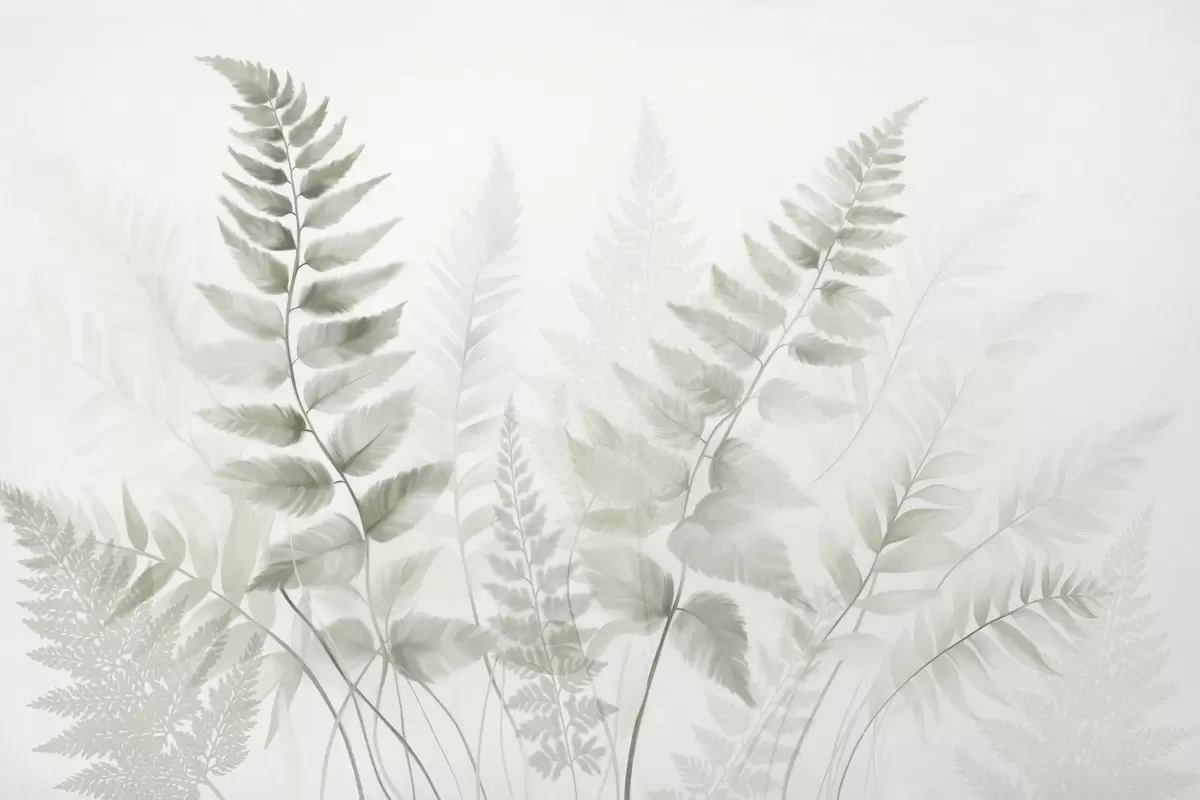 Fotobehang Getextureerde gedroogde varenbladeren in verschillende tinten groen, met een zachte, lichte achtergrond in aquarelstijl. N° w09615v1