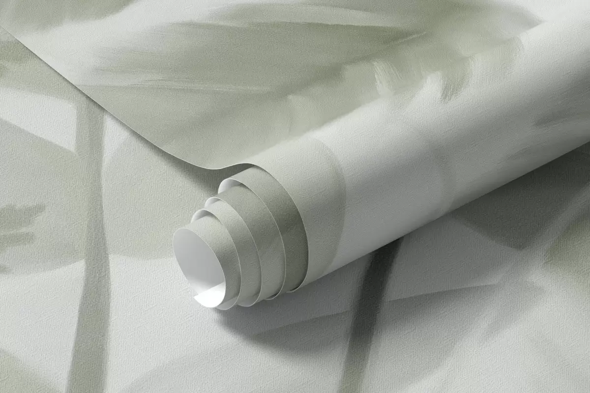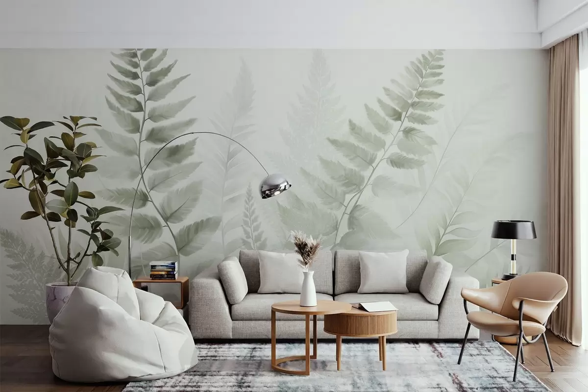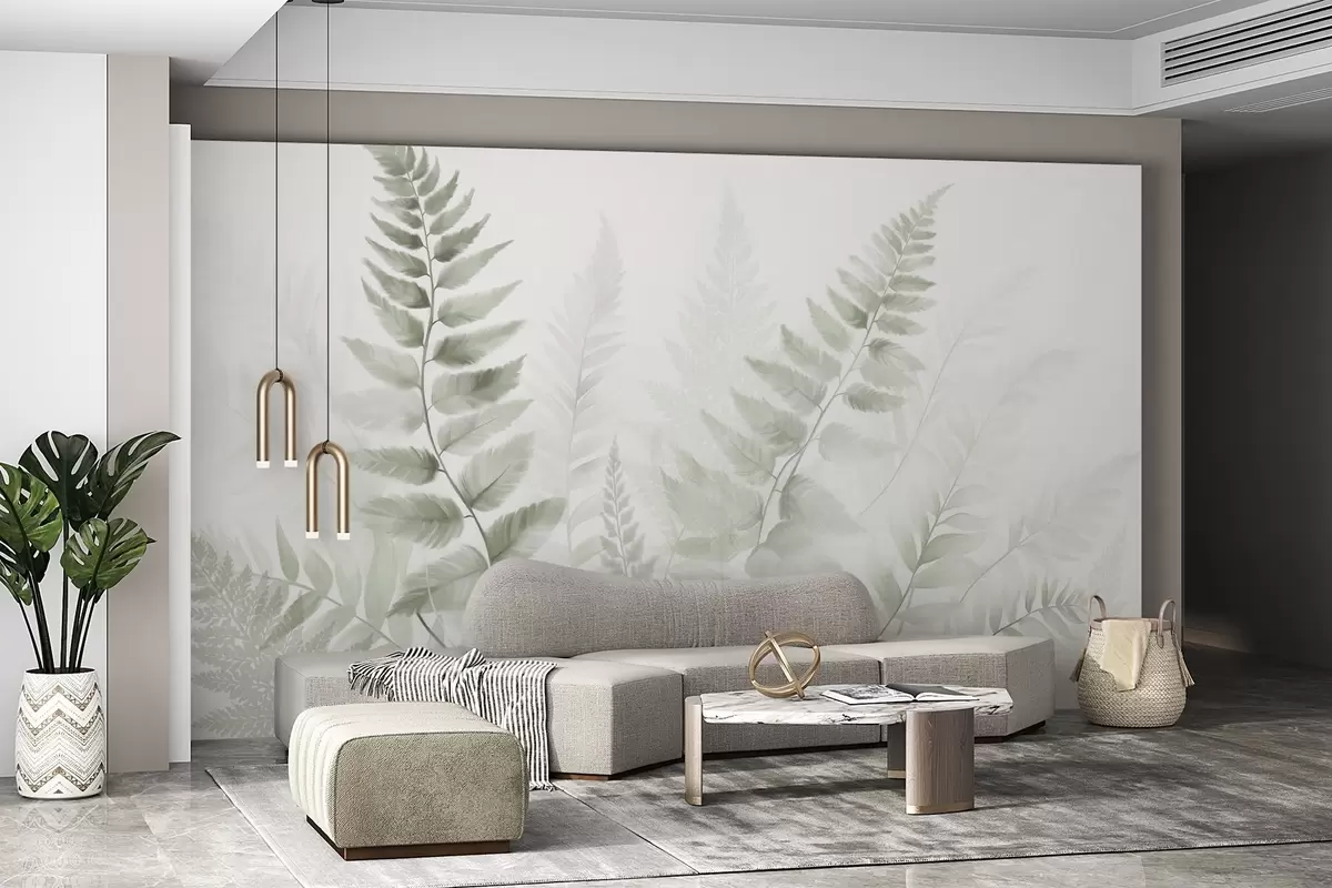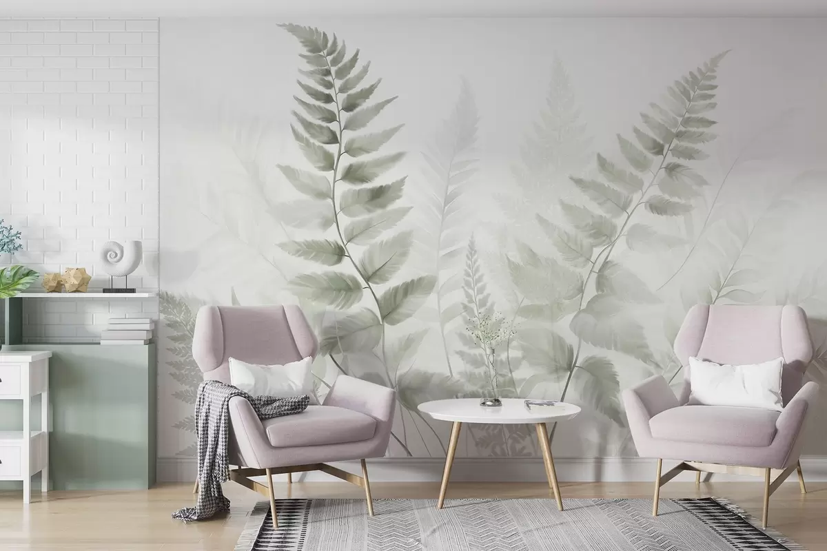 Fotobehang Getextureerde gedroogde varenbladeren in verschillende tinten groen, met een zachte, lichte achtergrond in aquarelstijl. N° w09615v1
