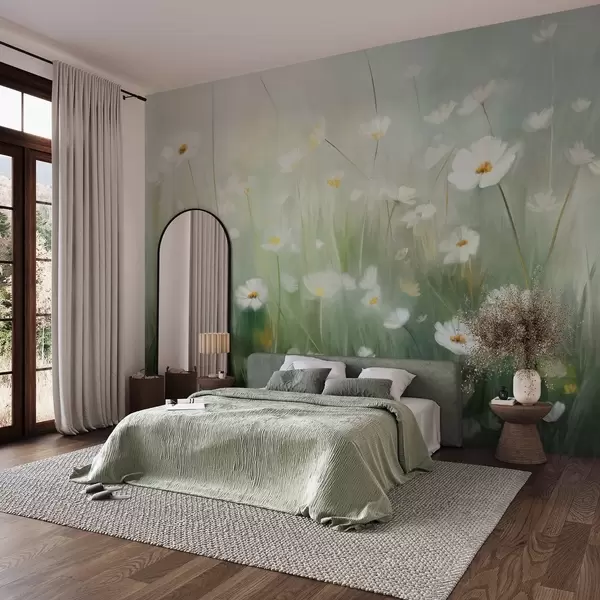 Fotobehang Abstract veld met witte madeliefjes, groen gras en een zachte, wazige achtergrond in schilderstijl N° w09619