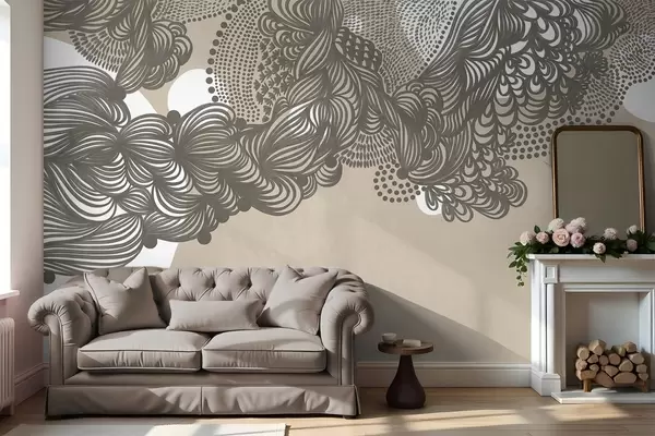 Fotobehang Abstract textuurontwerp op een beige achtergrond, met gedetailleerd lijnwerk en gestippelde texturen. N° w09621
