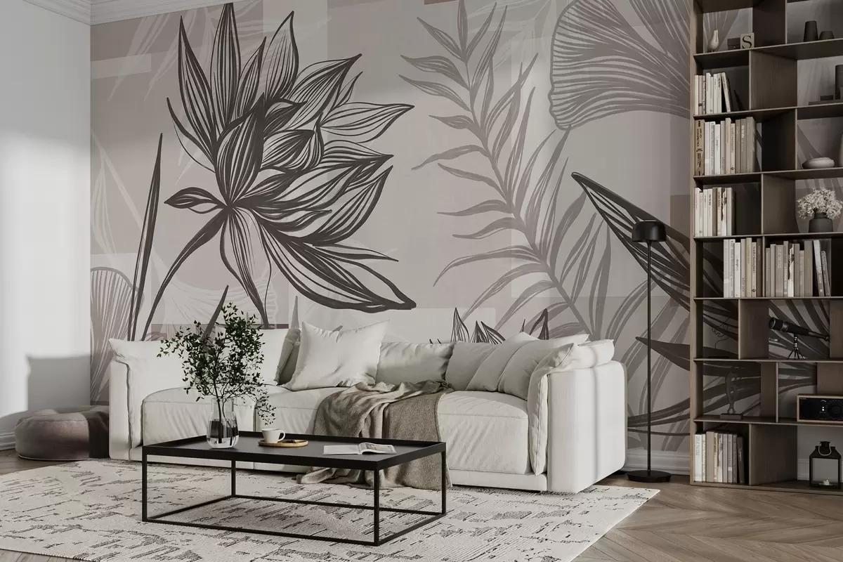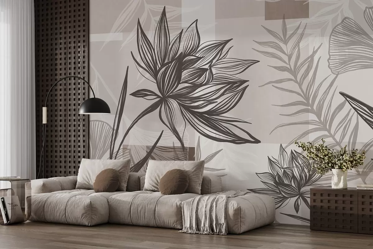 Fotobehang Gestileerde bloemen en bladeren met textuur in bruine en beige tinten, met een geometrische achtergrond, lijntekening N° w09629