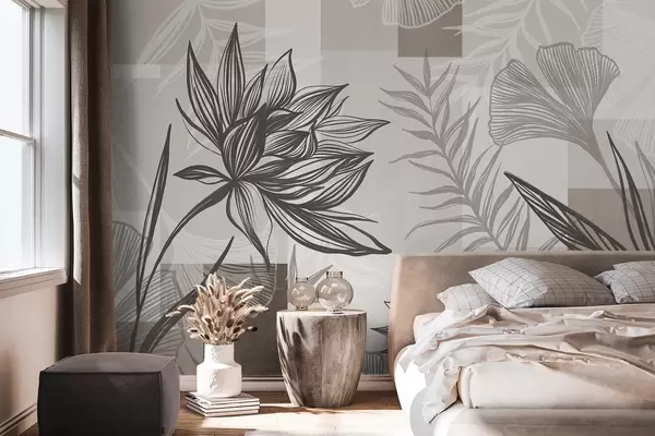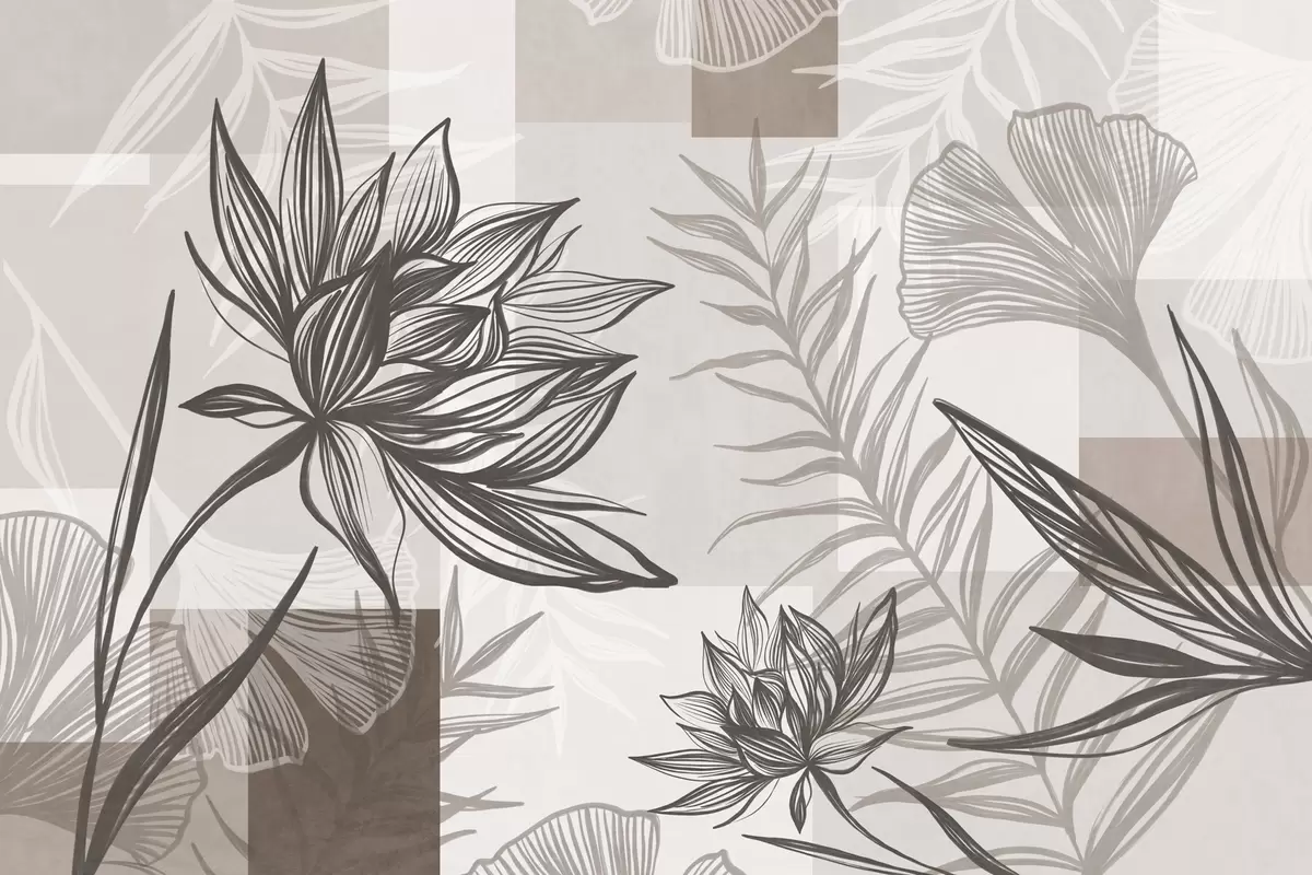 Fotobehang Gestileerde bloemen en bladeren met textuur in bruine en beige tinten, met een geometrische achtergrond, lijntekening N° w09629