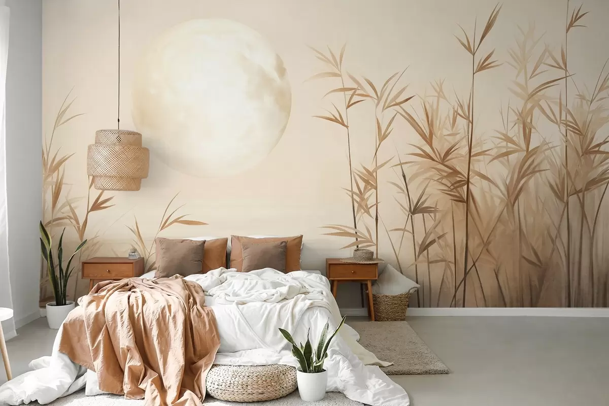 Fotobehang Getextureerd landschap met hoog riet, een meer en een bleke maan aan een nevelige hemel N° w09631