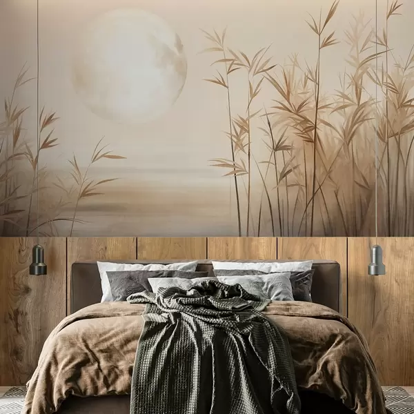 Fotobehang Getextureerd landschap met hoog riet, een meer en een bleke maan aan een nevelige hemel N° w09631