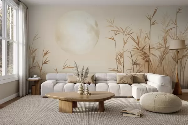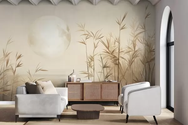 Fotobehang Getextureerd landschap met hoog riet, een meer en een bleke maan aan een nevelige hemel N° w09631