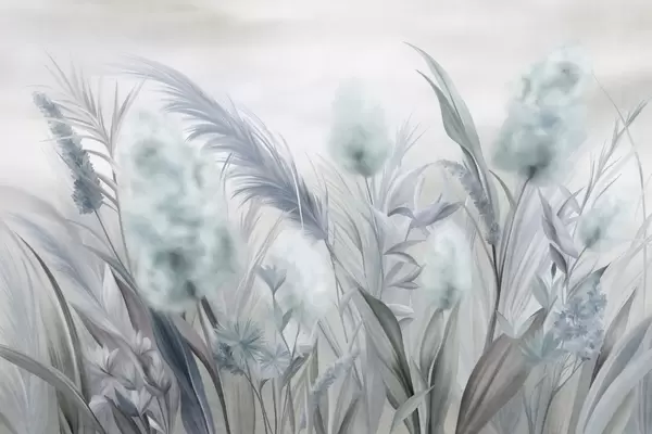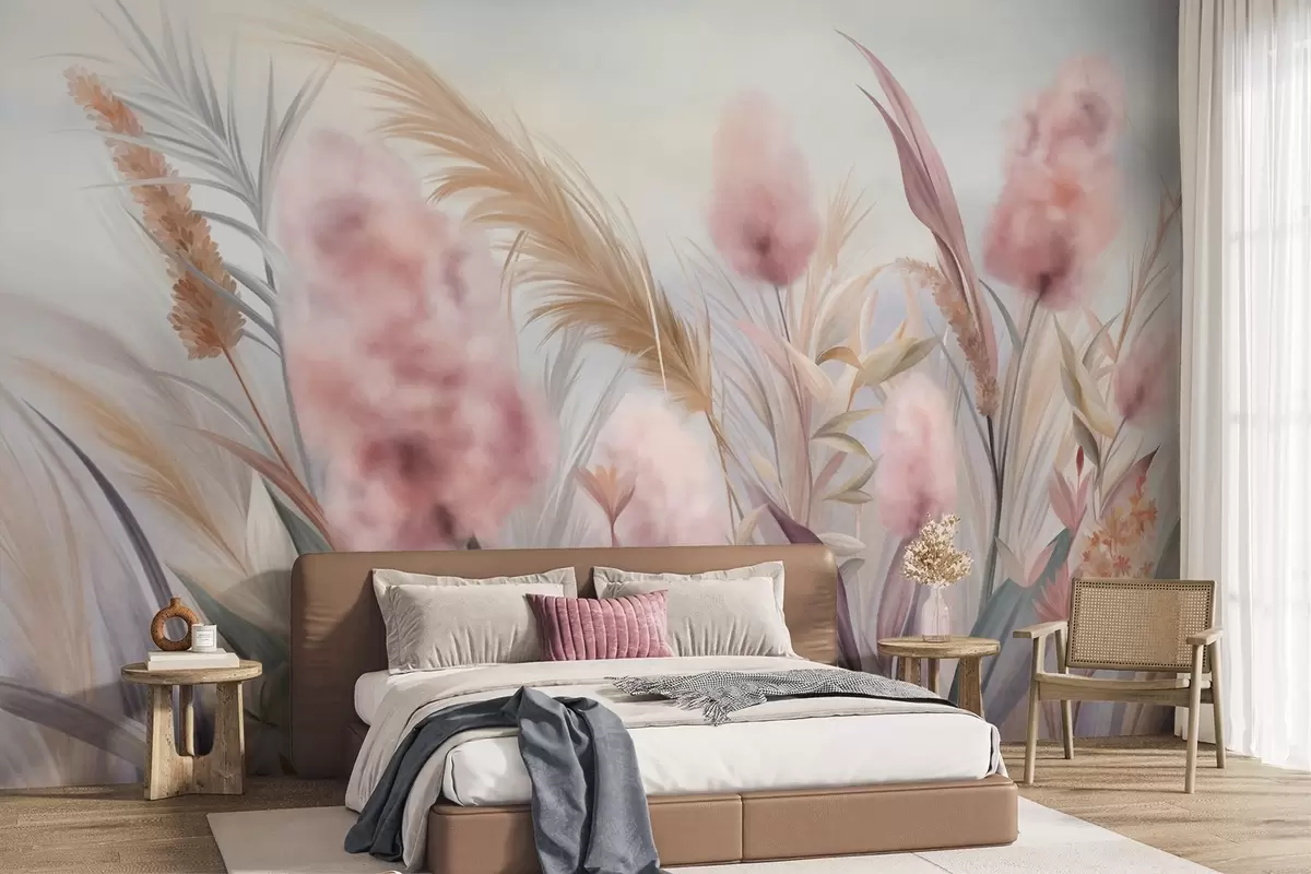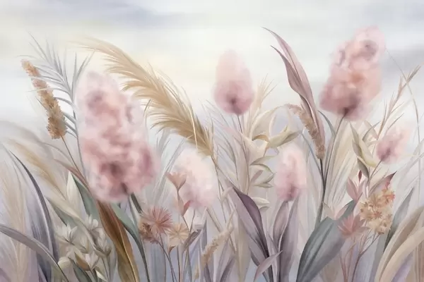 Fotobehang Roze en beige pampagras en andere gedroogde bloemen met een zachte, wazige lucht op de achtergrond N° w09635