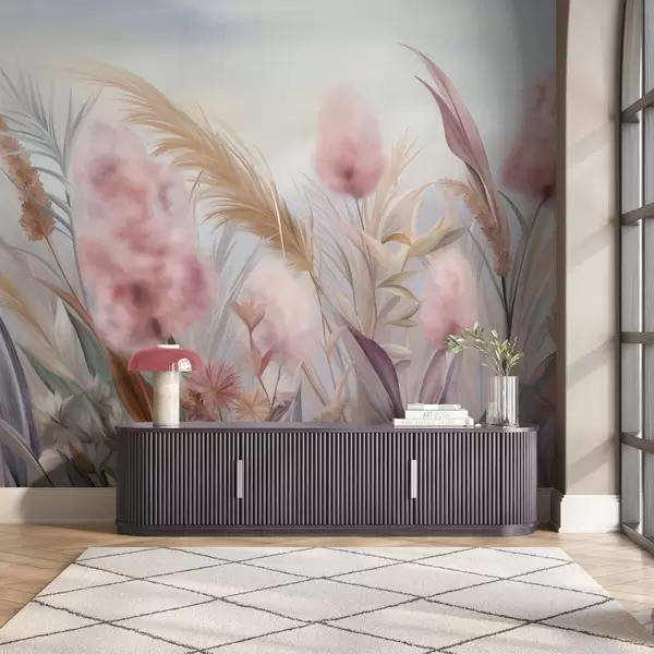 Fotobehang Roze en beige pampagras en andere gedroogde bloemen met een zachte, wazige lucht op de achtergrond N° w09635