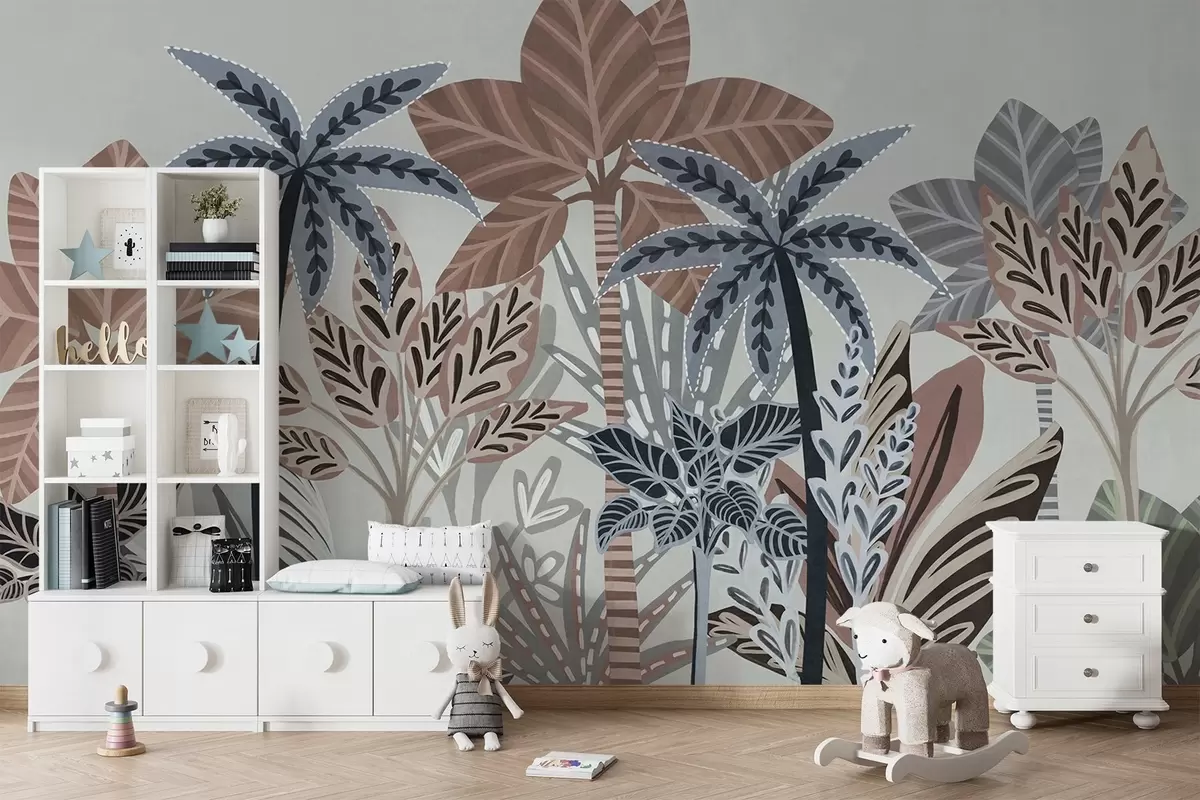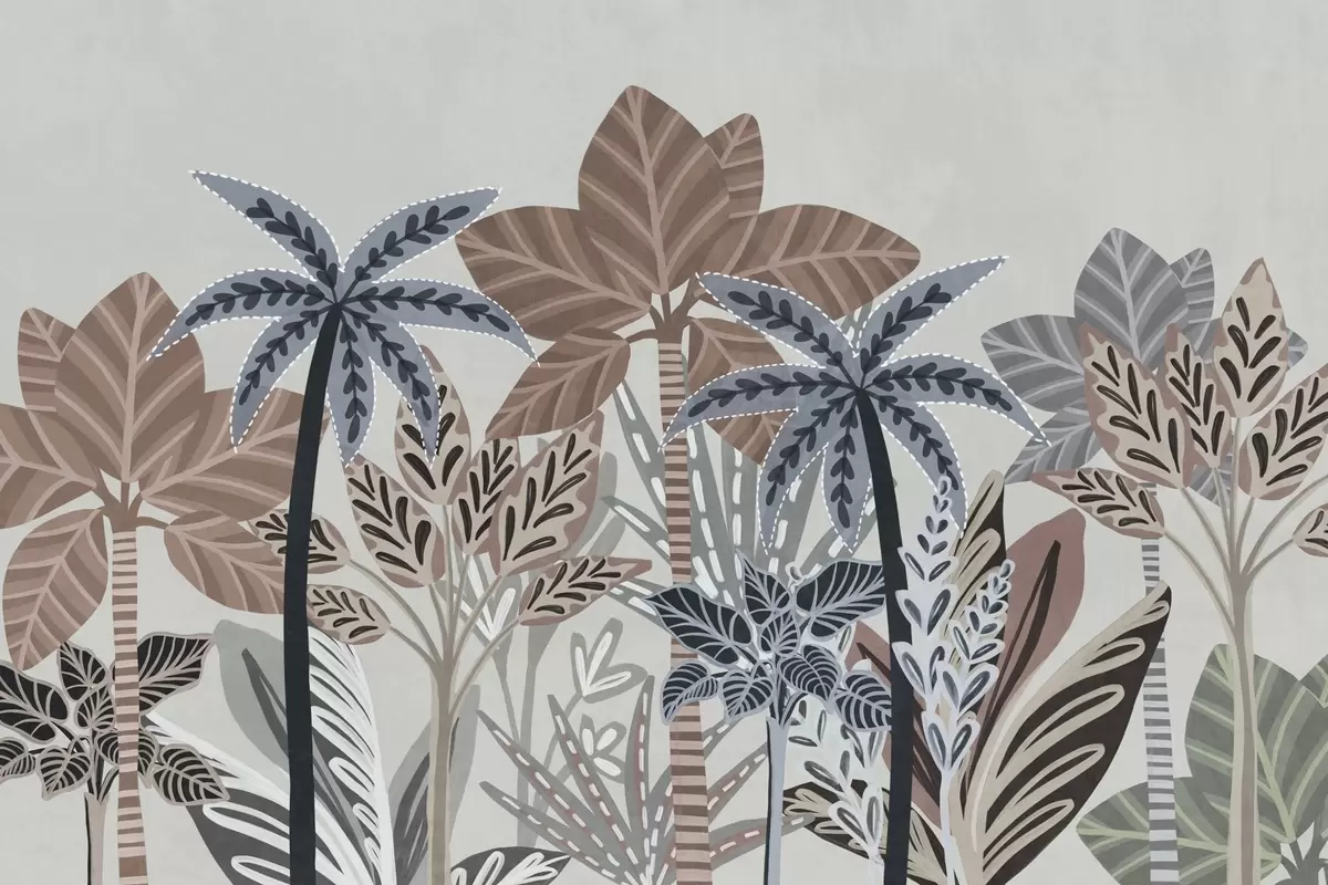 Fotobehang Getextureerde tropische planten en palmbomen met gedempte kleuren in decoratieve boho-stijl tegen een grijze achtergrond N° w09639v1