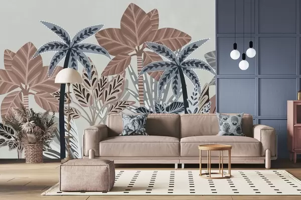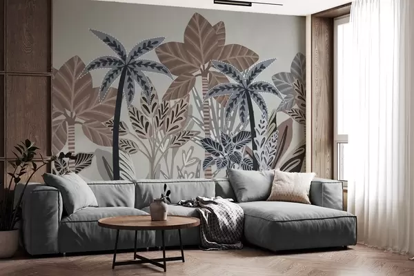 Fotobehang Getextureerde tropische planten en palmbomen met gedempte kleuren in decoratieve boho-stijl tegen een grijze achtergrond N° w09639v1