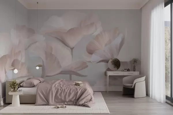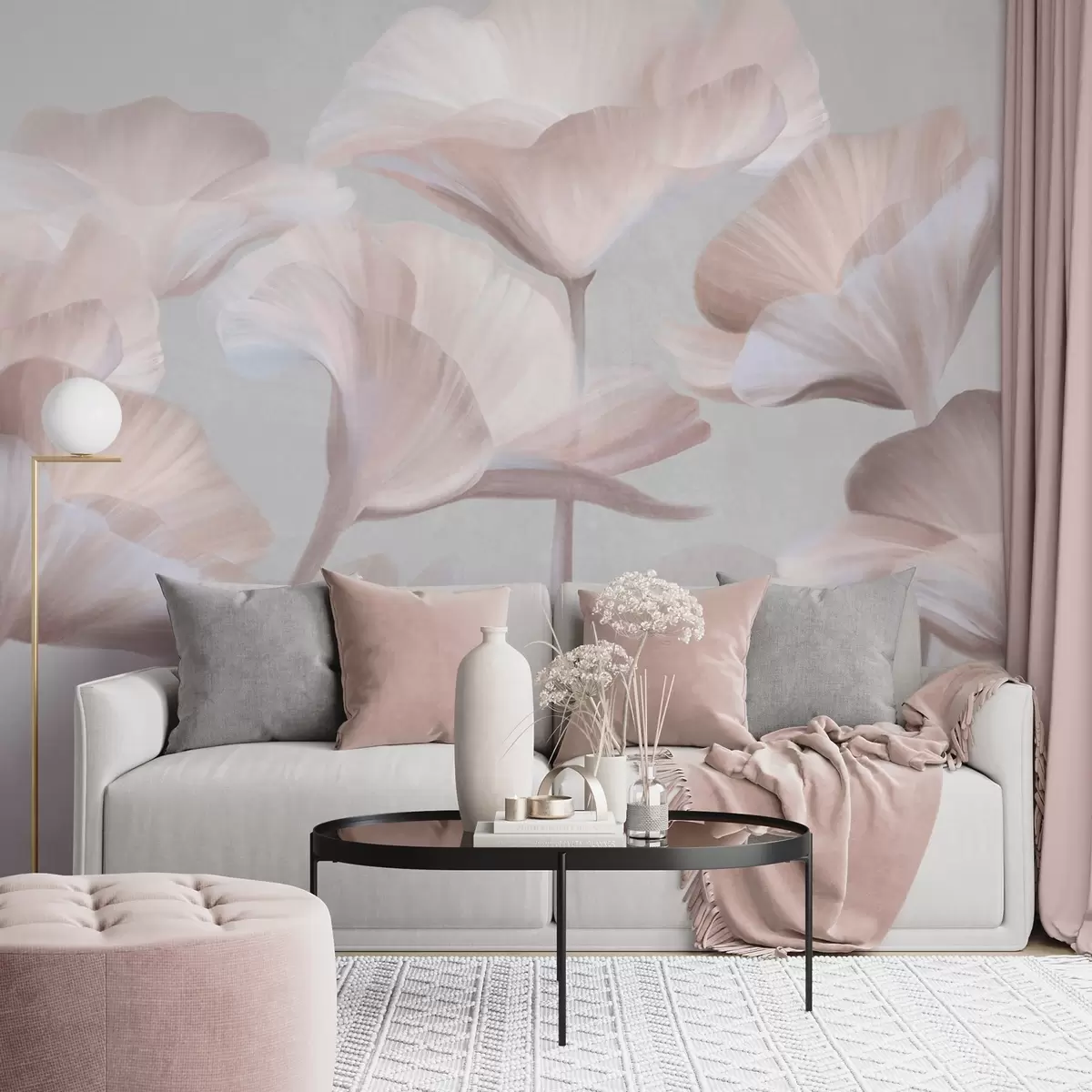Fotobehang Lichtperzikkleurige, doorschijnende lotusbloemen met delicate bloemblaadjes tegen een gedempte grijze achtergrond N° w09640
