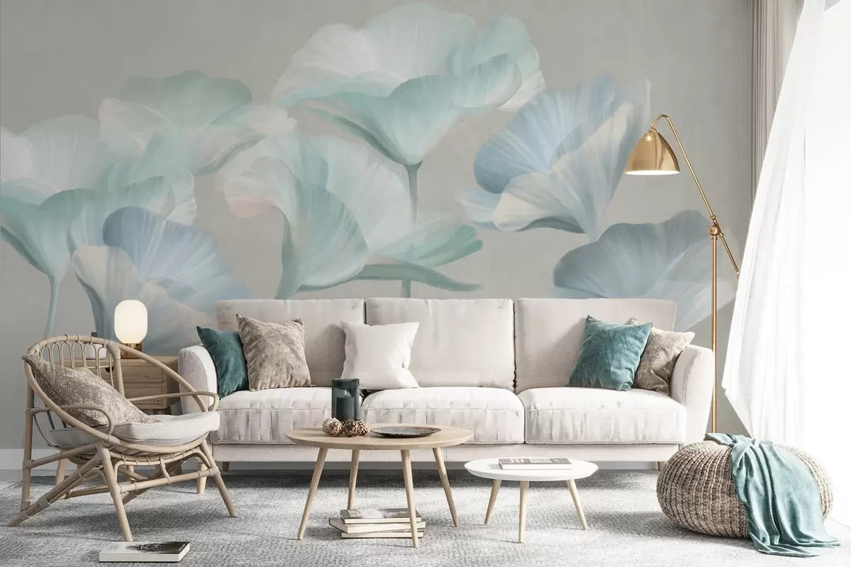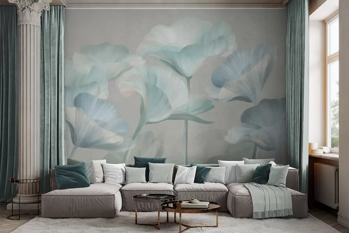 Fotobehang Lichtturquoise, doorschijnende lotusbloemen met delicate bloemblaadjes tegen een gedempte grijze achtergrond N° w09640v2