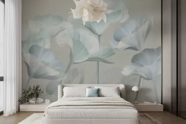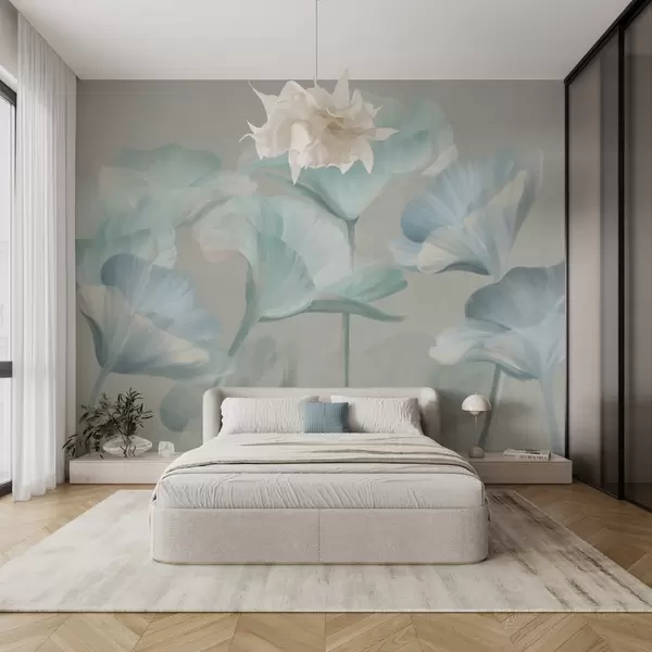 Fotobehang Lichtturquoise, doorschijnende lotusbloemen met delicate bloemblaadjes tegen een gedempte grijze achtergrond N° w09640v2
