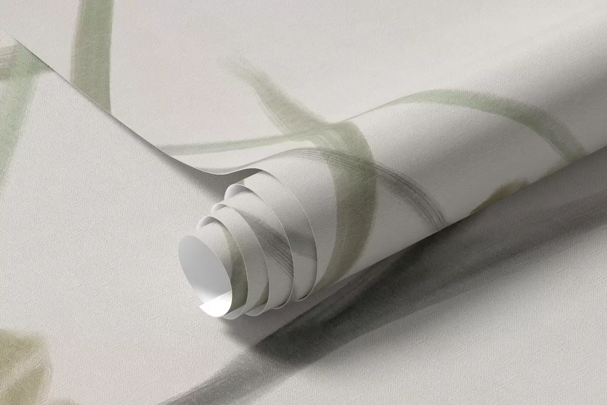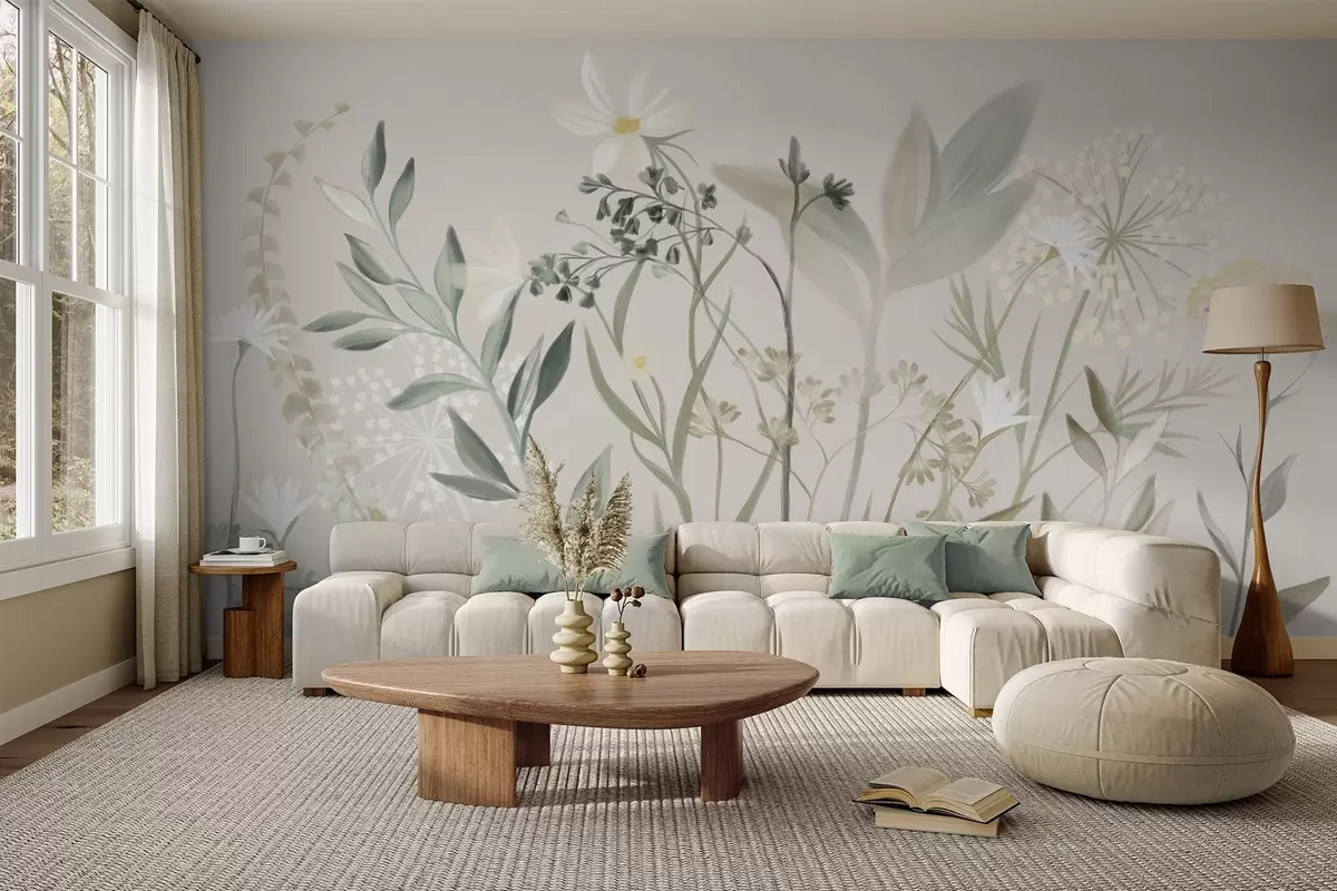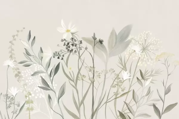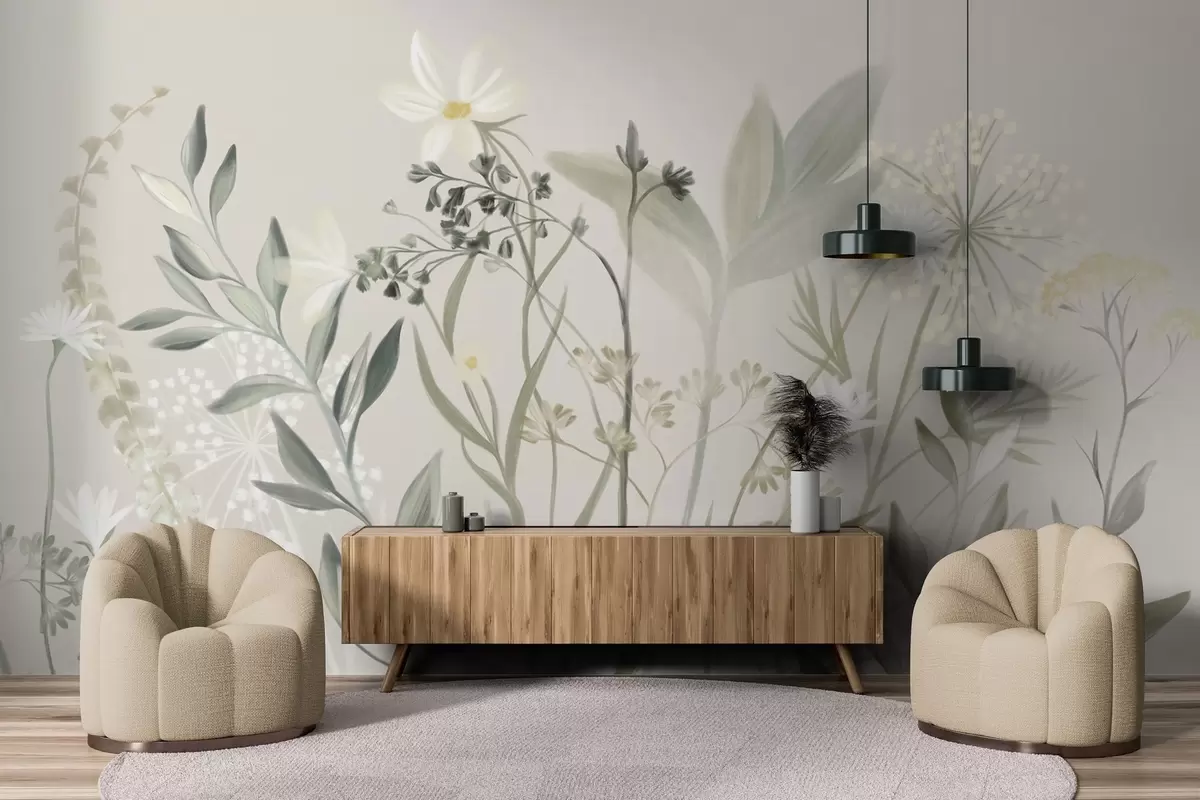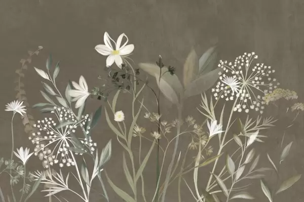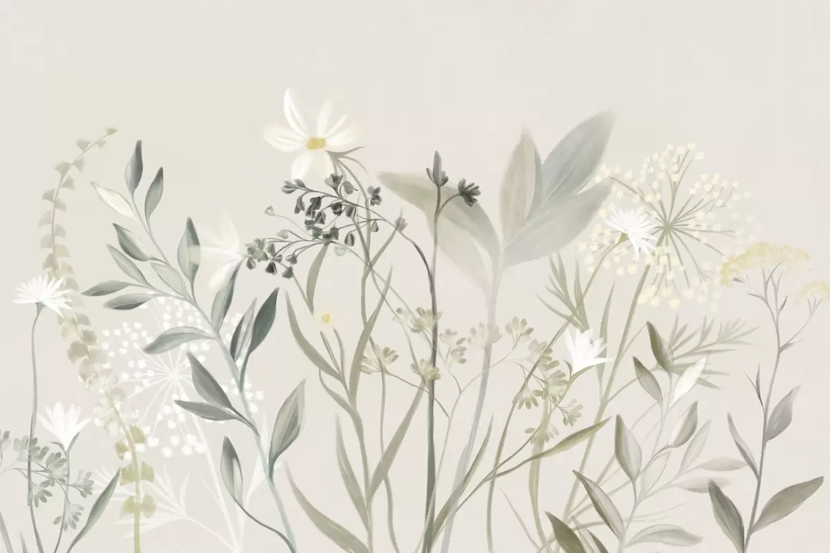 Fotobehang Delicate wilde bloemen en bladeren met een subtiele textuur in gedempte groene en crèmekleurige tinten tegen een zachte beige achtergrond N° w09641