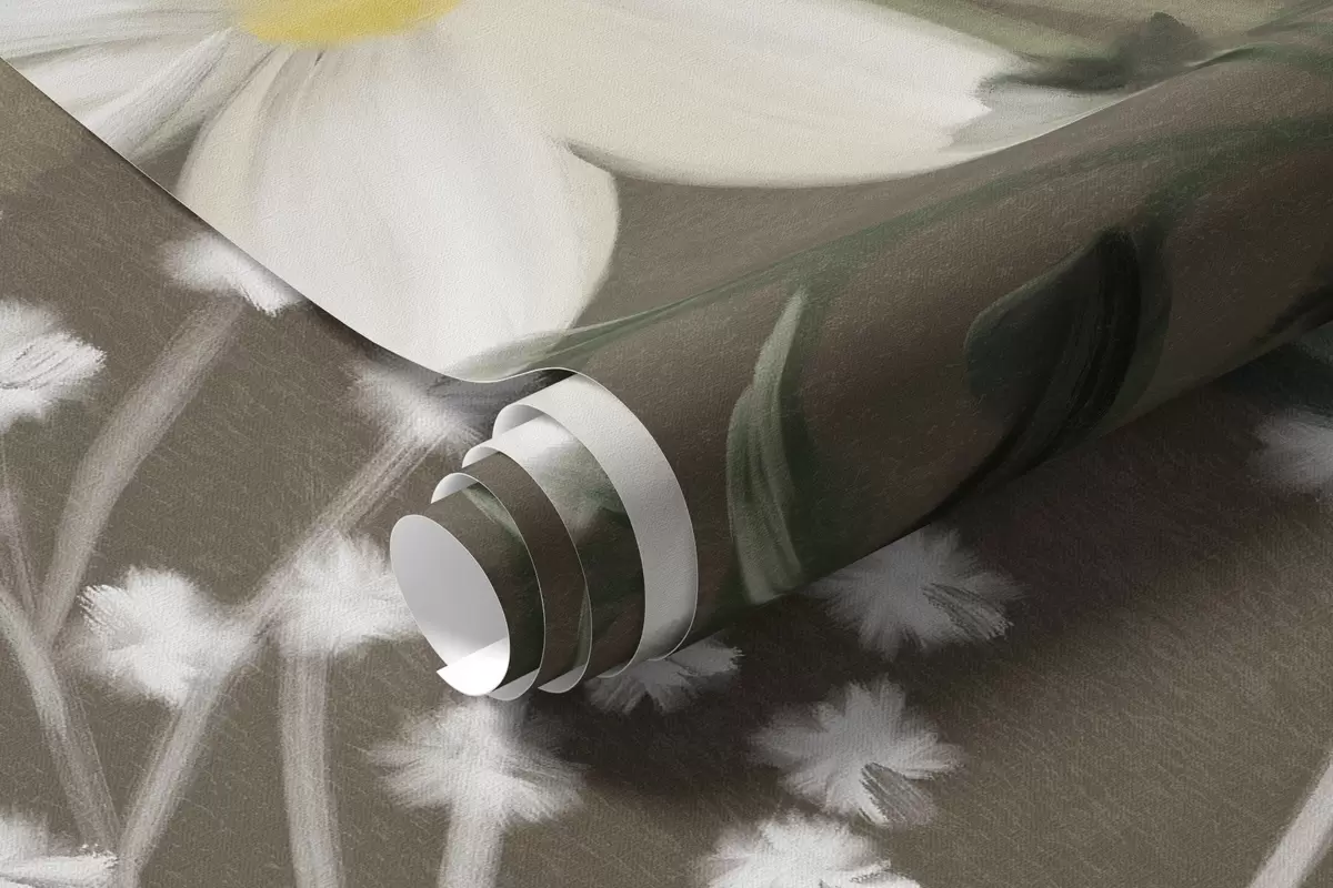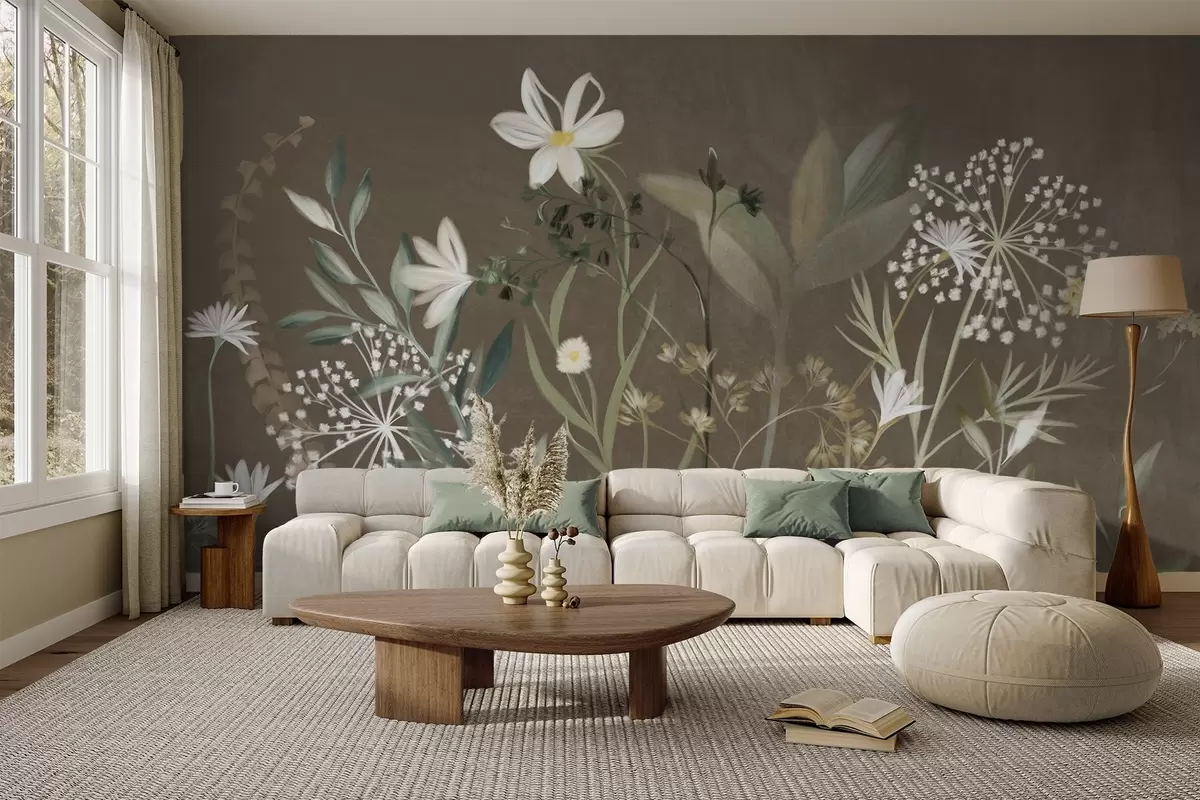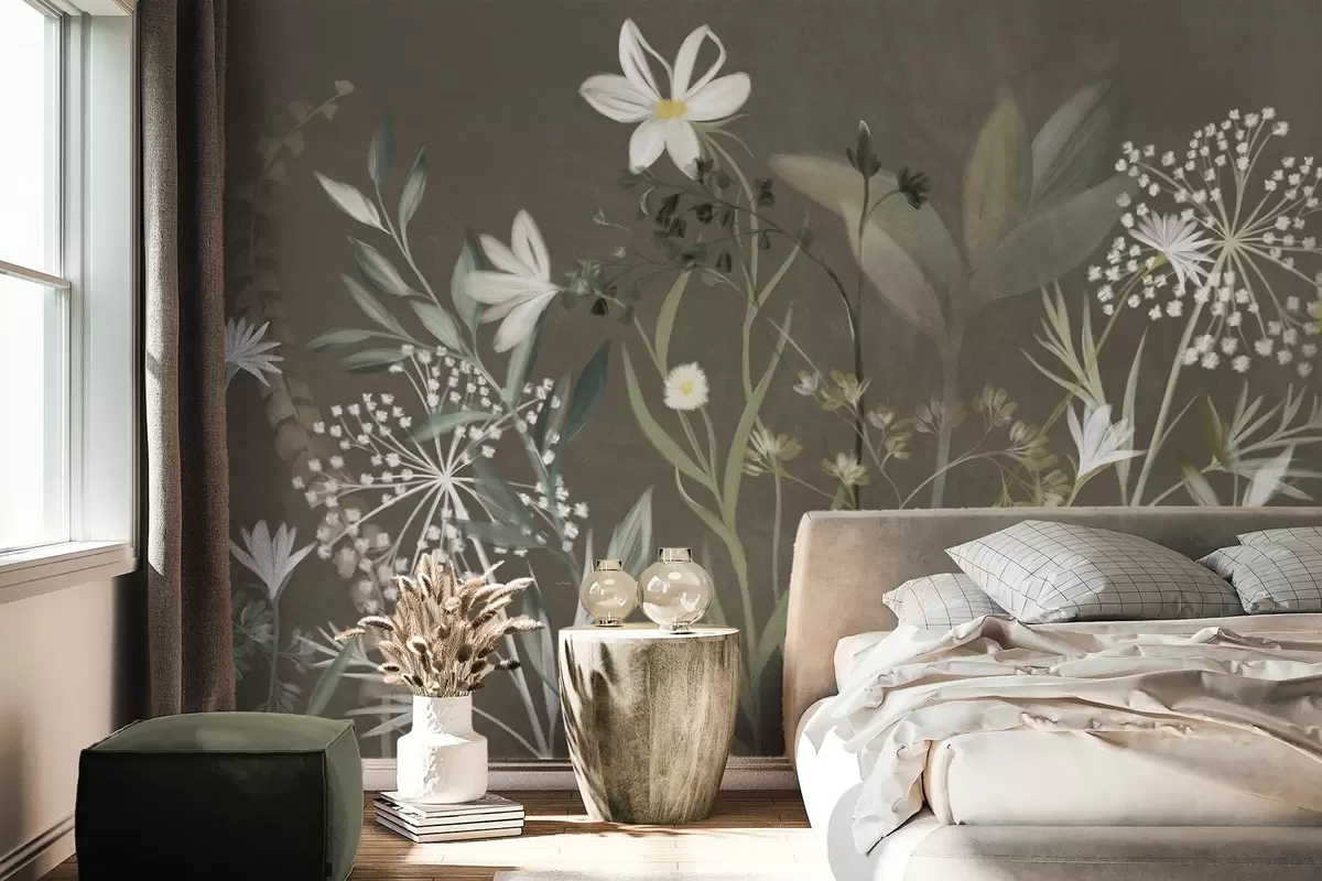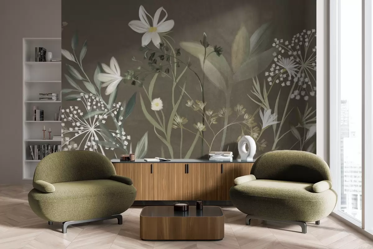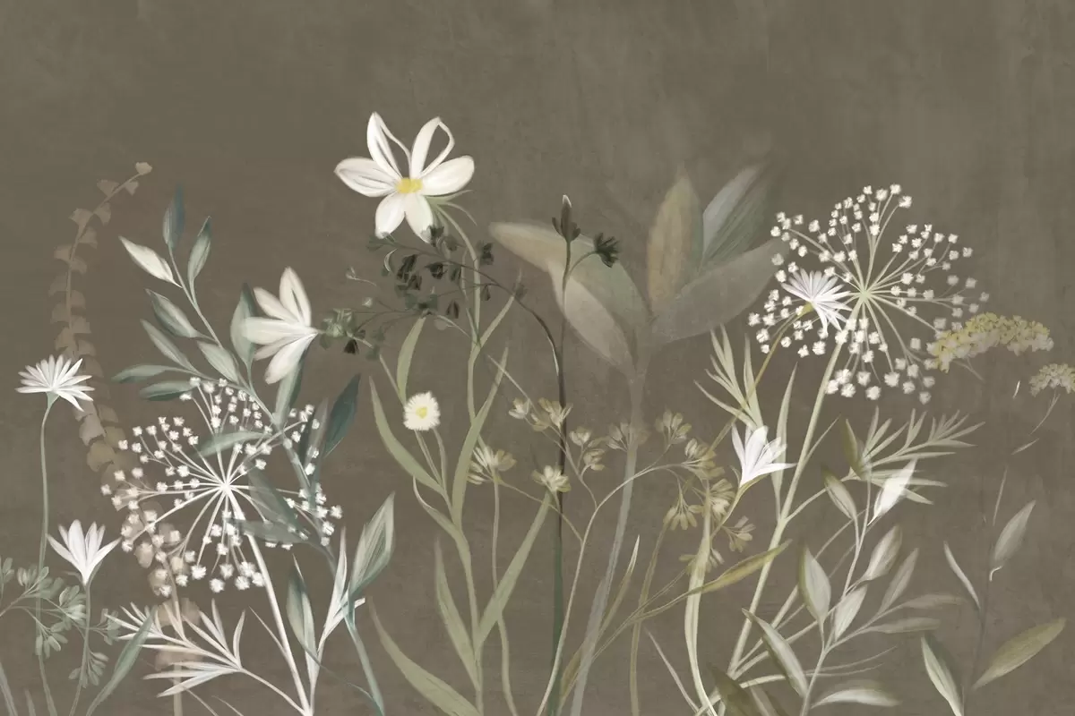 Fotobehang Delicate wilde bloemen en bladeren met een subtiele textuur in gedempte groene en crèmekleurige tinten tegen een bruine achtergrond N° w09641v1