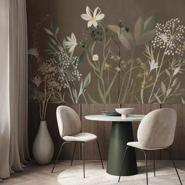 Fotobehang Delicate wilde bloemen en bladeren met een subtiele textuur in gedempte groene en crèmekleurige tinten tegen een bruine achtergrond N° w09641v1