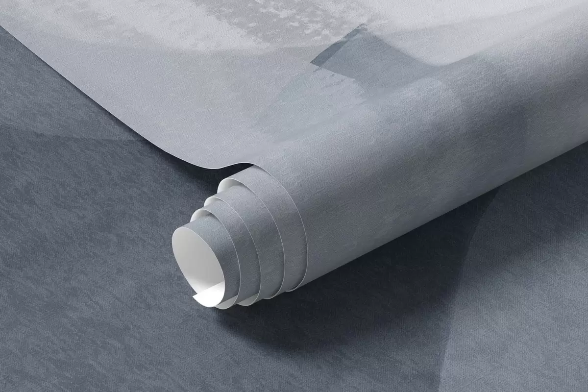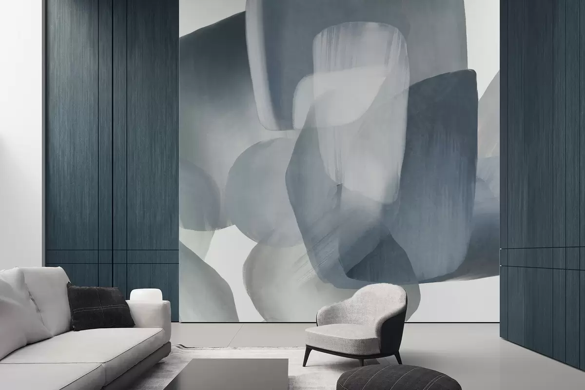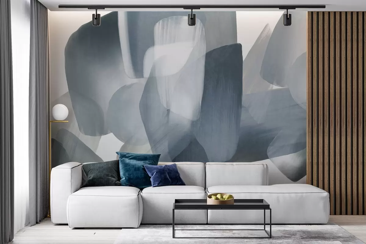 Fotobehang Abstracte vormen met textuur in gedempte blauwe en grijze kleuren, met zachte randen en overlappende lagen. N° w09642v1