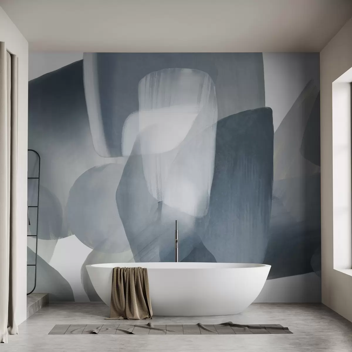 Fotobehang Abstracte vormen met textuur in gedempte blauwe en grijze kleuren, met zachte randen en overlappende lagen. N° w09642v1