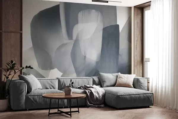 Fotobehang Abstracte vormen met textuur in gedempte blauwe en grijze kleuren, met zachte randen en overlappende lagen. N° w09642v1