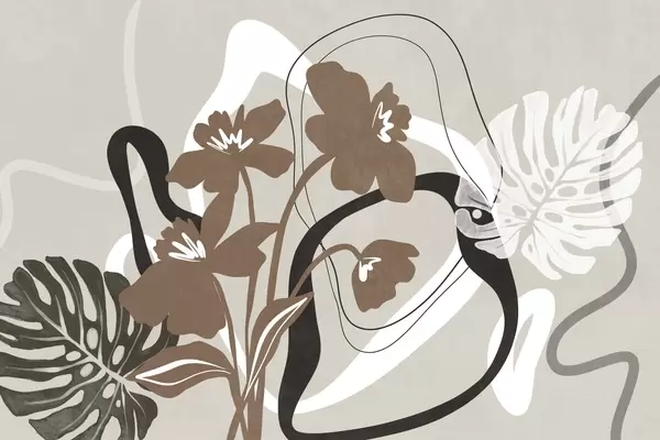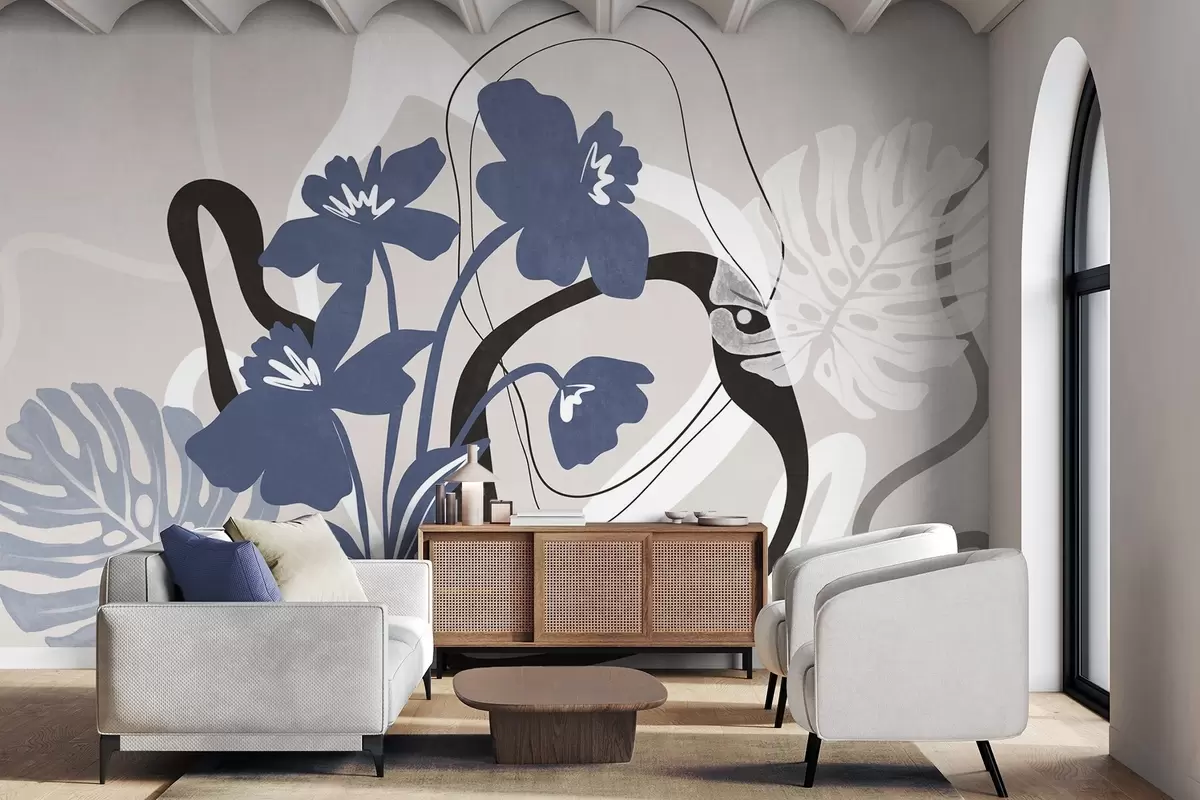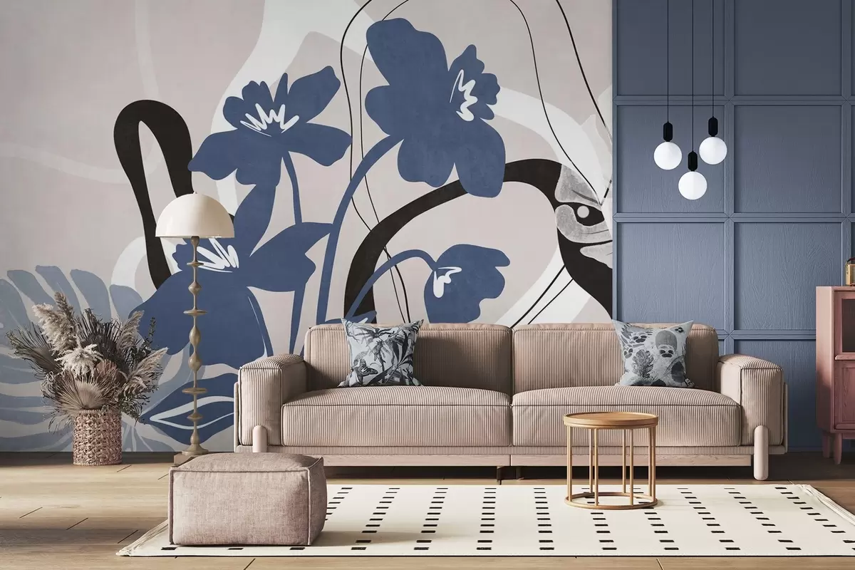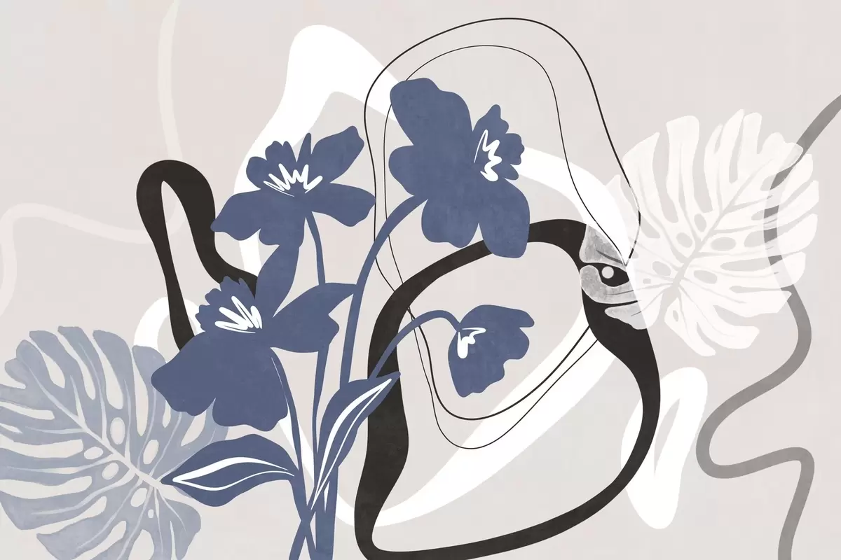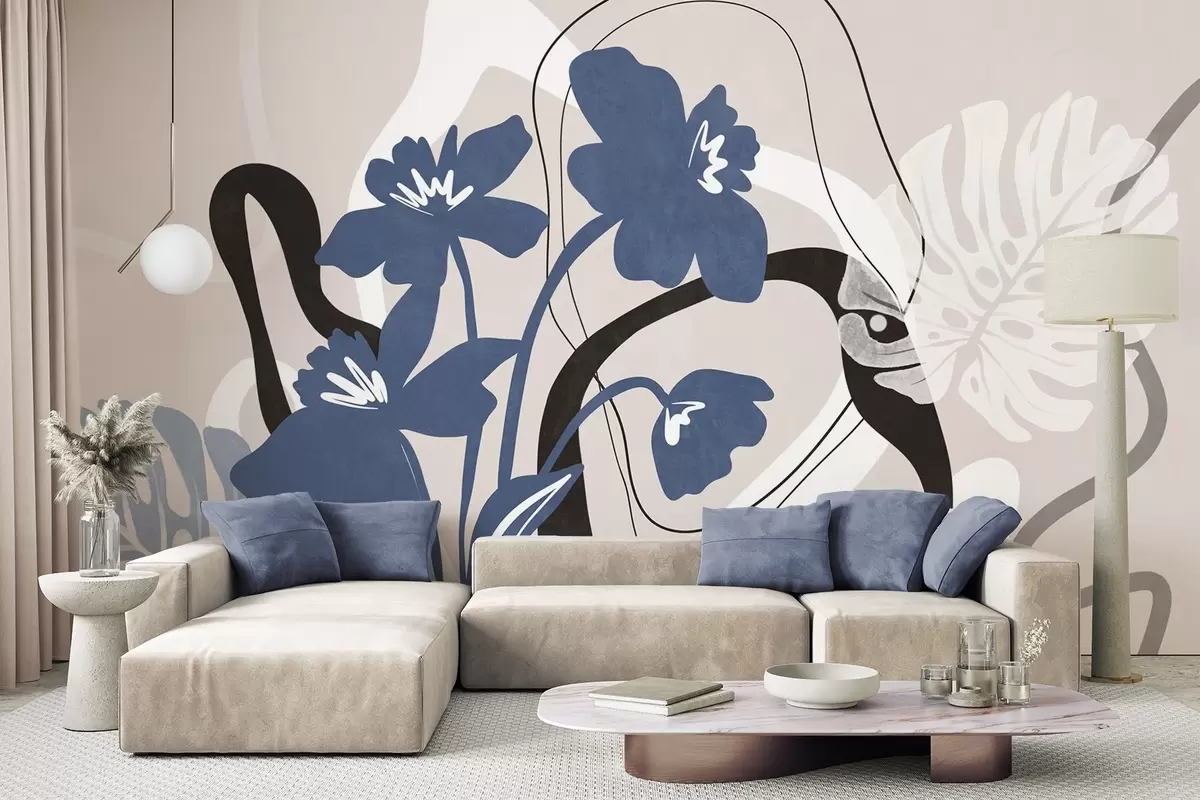 Fotobehang Abstracte blauwe bloemen met textuur en witte en zwarte vormen tegen een lichtbeige achtergrond, minimalistische kunst N° w09645