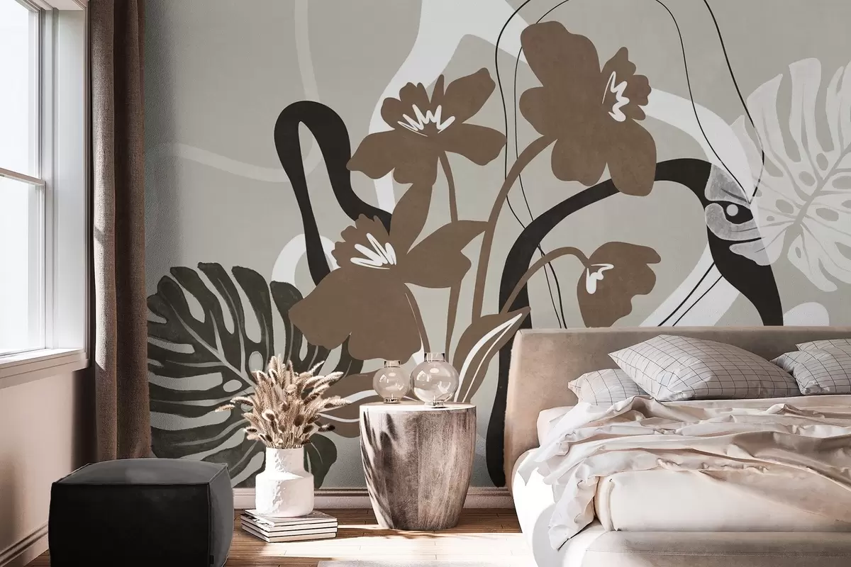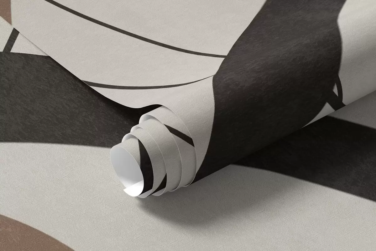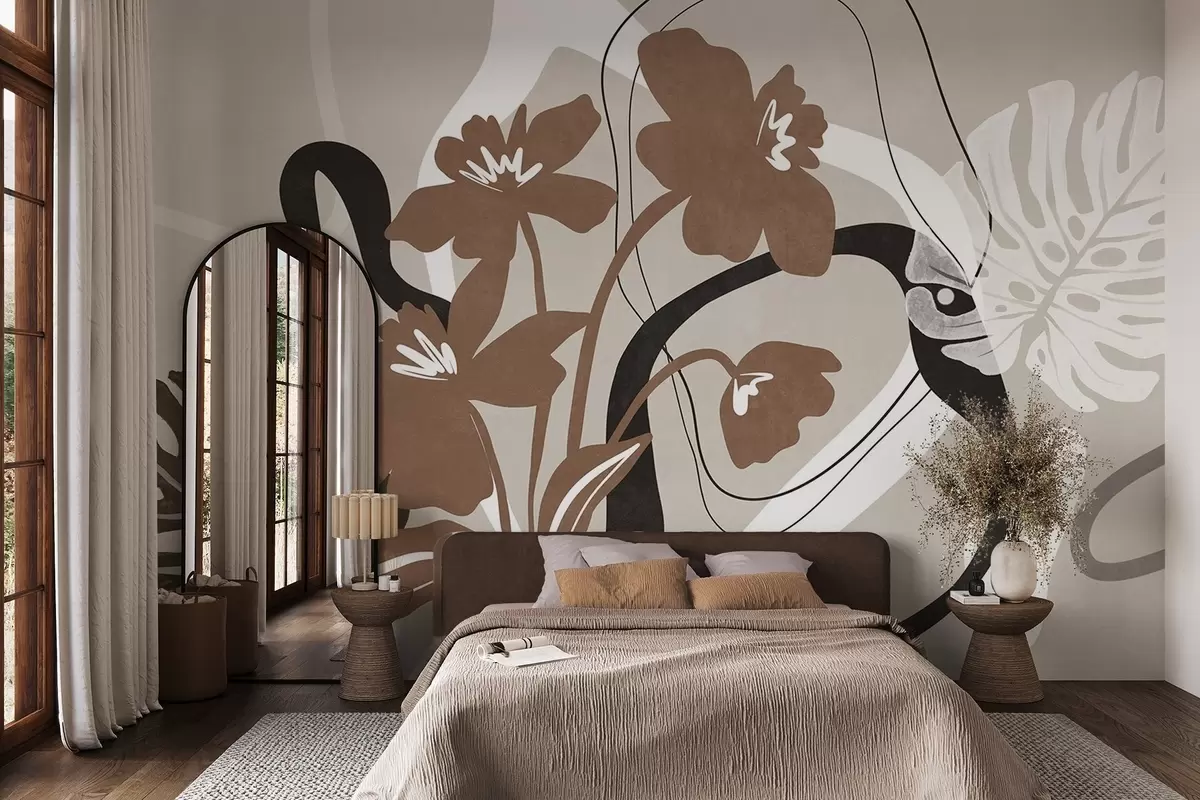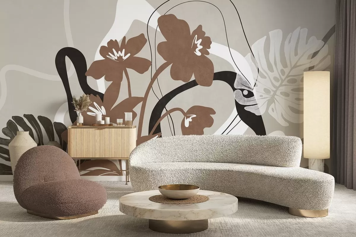 Fotobehang Abstracte bruine bloemen met textuur en witte en zwarte vormen tegen een beige achtergrond, minimalistische kunst N° w09645v1