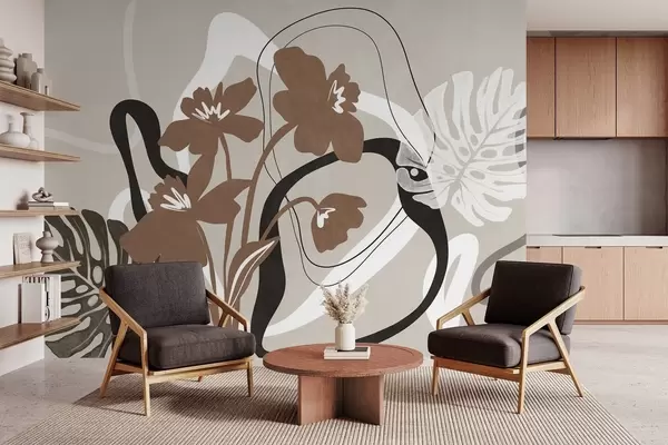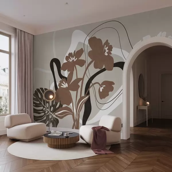 Fotobehang Abstracte bruine bloemen met textuur en witte en zwarte vormen tegen een beige achtergrond, minimalistische kunst N° w09645v1