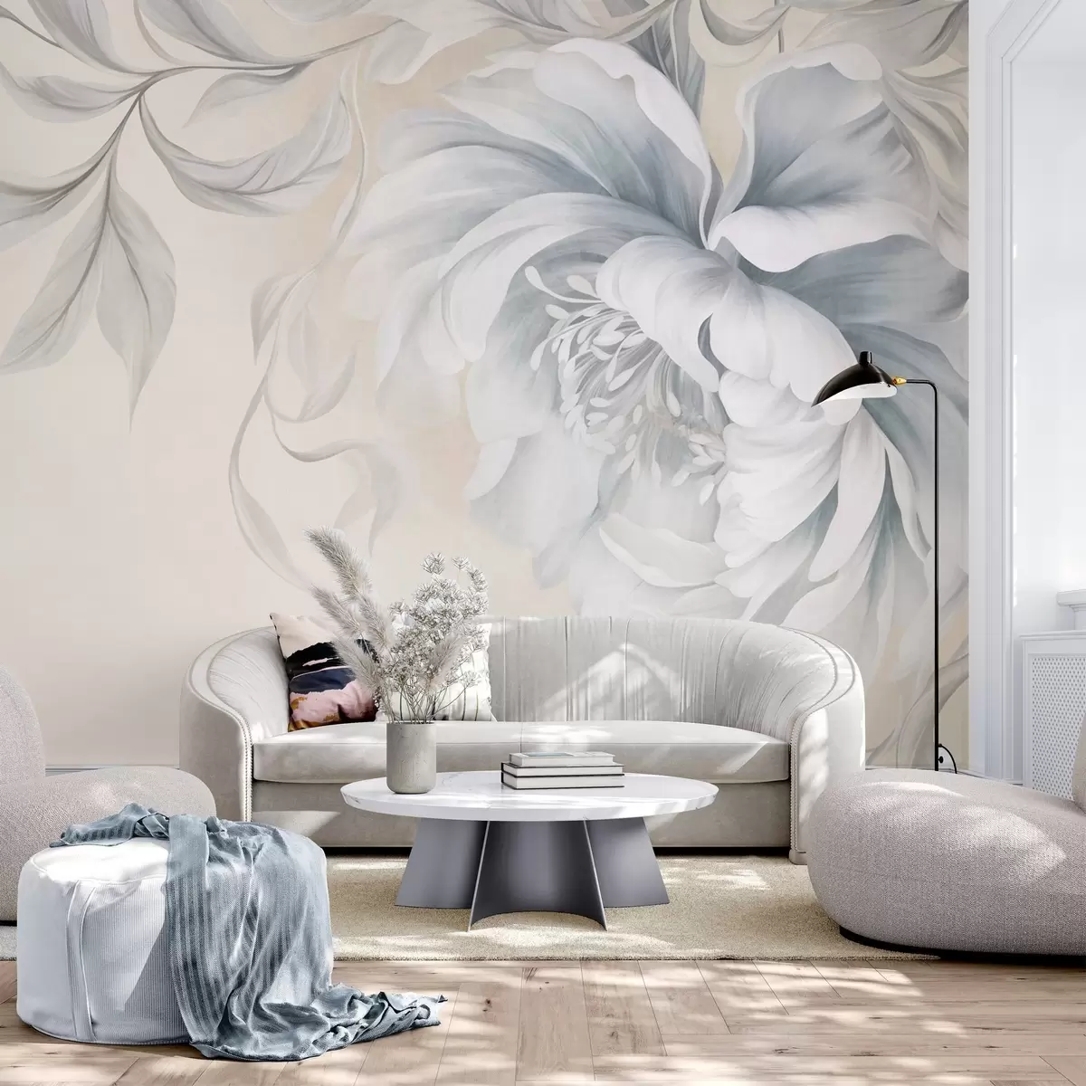 Fotobehang Grote pioenroos met een gestructureerd blad, delicate bloemblaadjes en grijze bladeren, geschilderd in een zachte stijl N° w09647