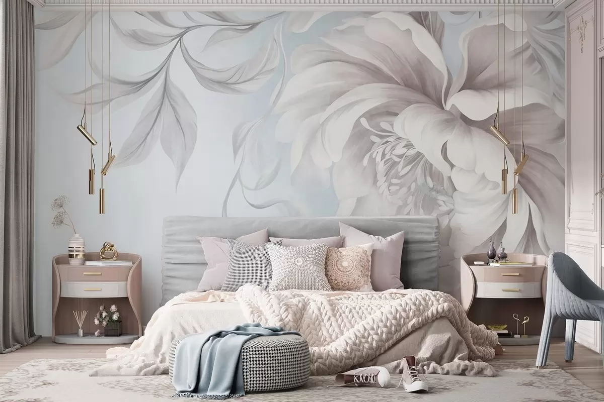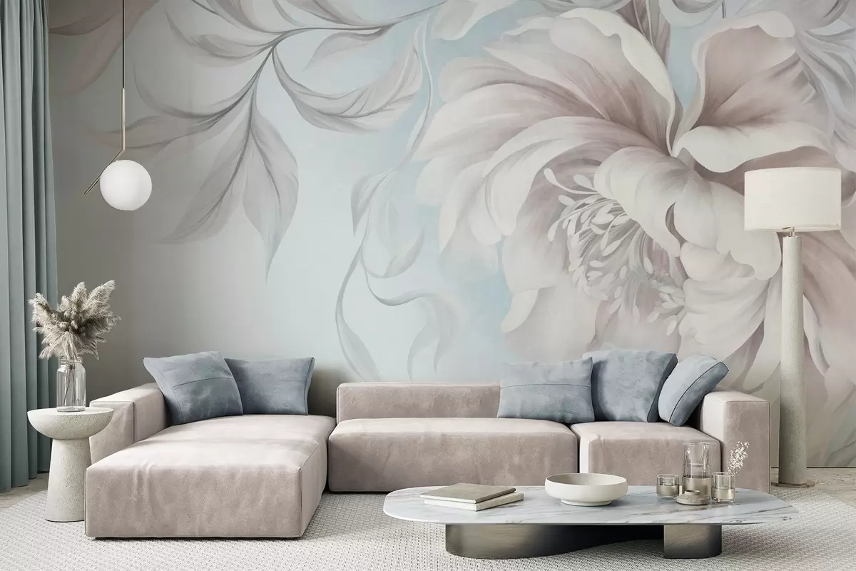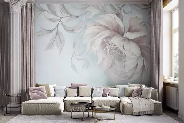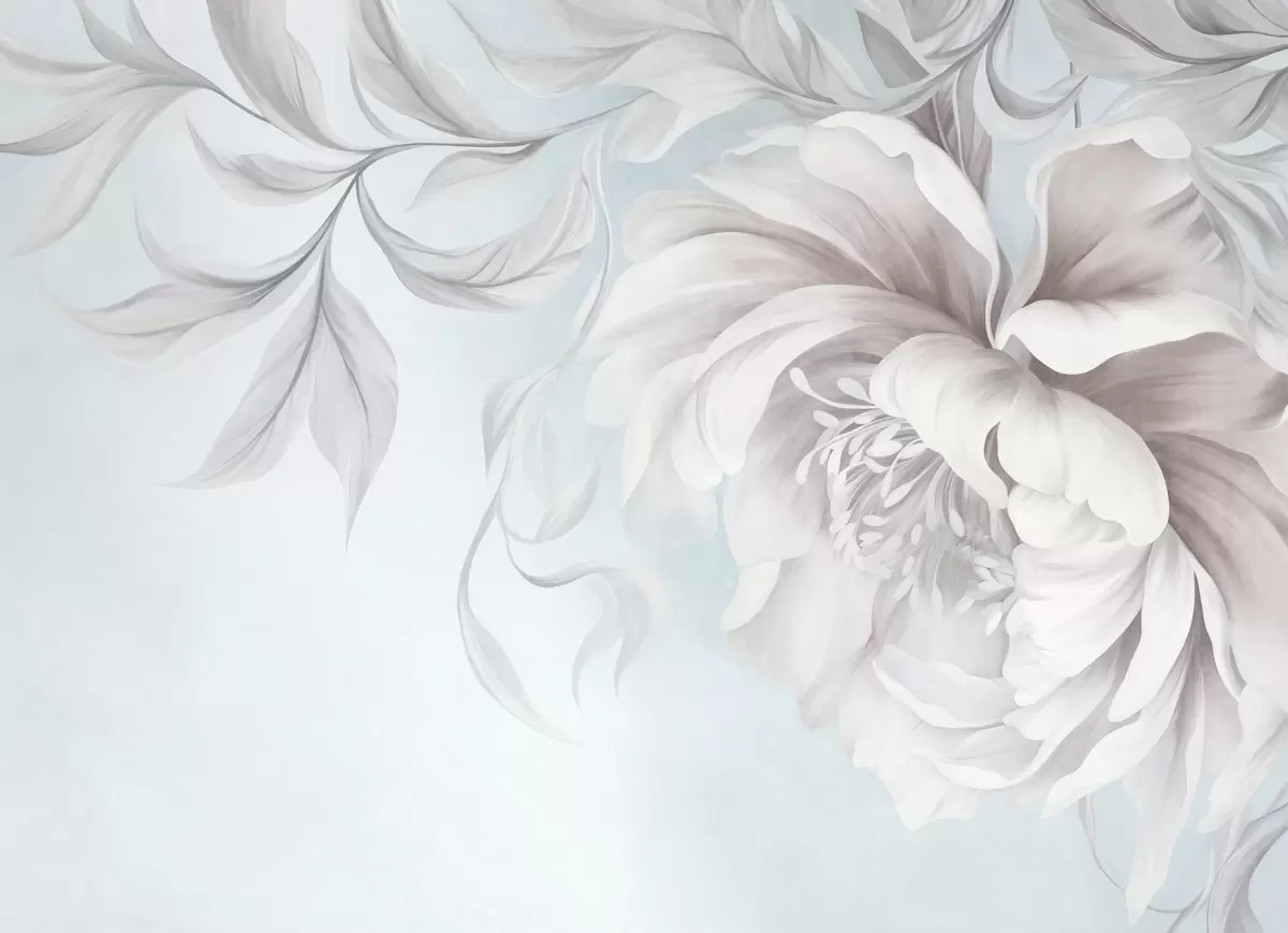 Fotobehang Grote pioenroos met een gestructureerd blad, delicate bloemblaadjes en grijze bladeren, geschilderd in een zachte stijl N° w09647v1