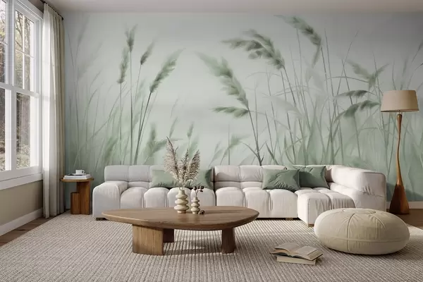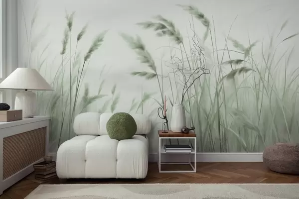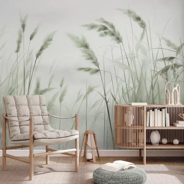 Fotobehang Hoog, gestructureerd droog gras met korenaren in het veld tegen een zachte, bleke achtergrond N° w09648v1