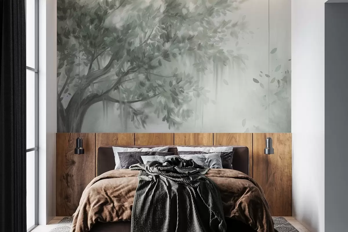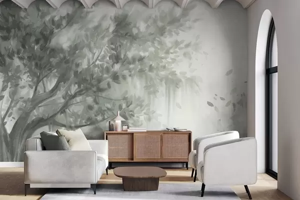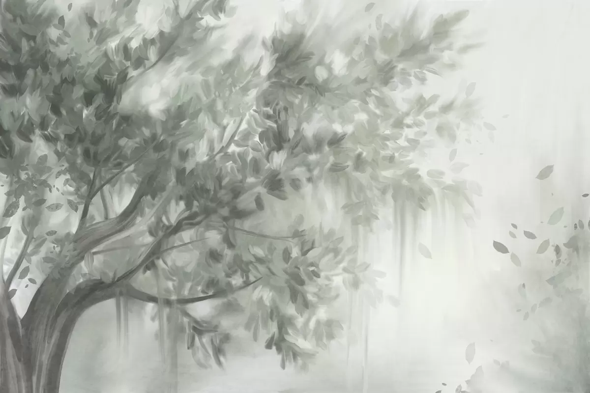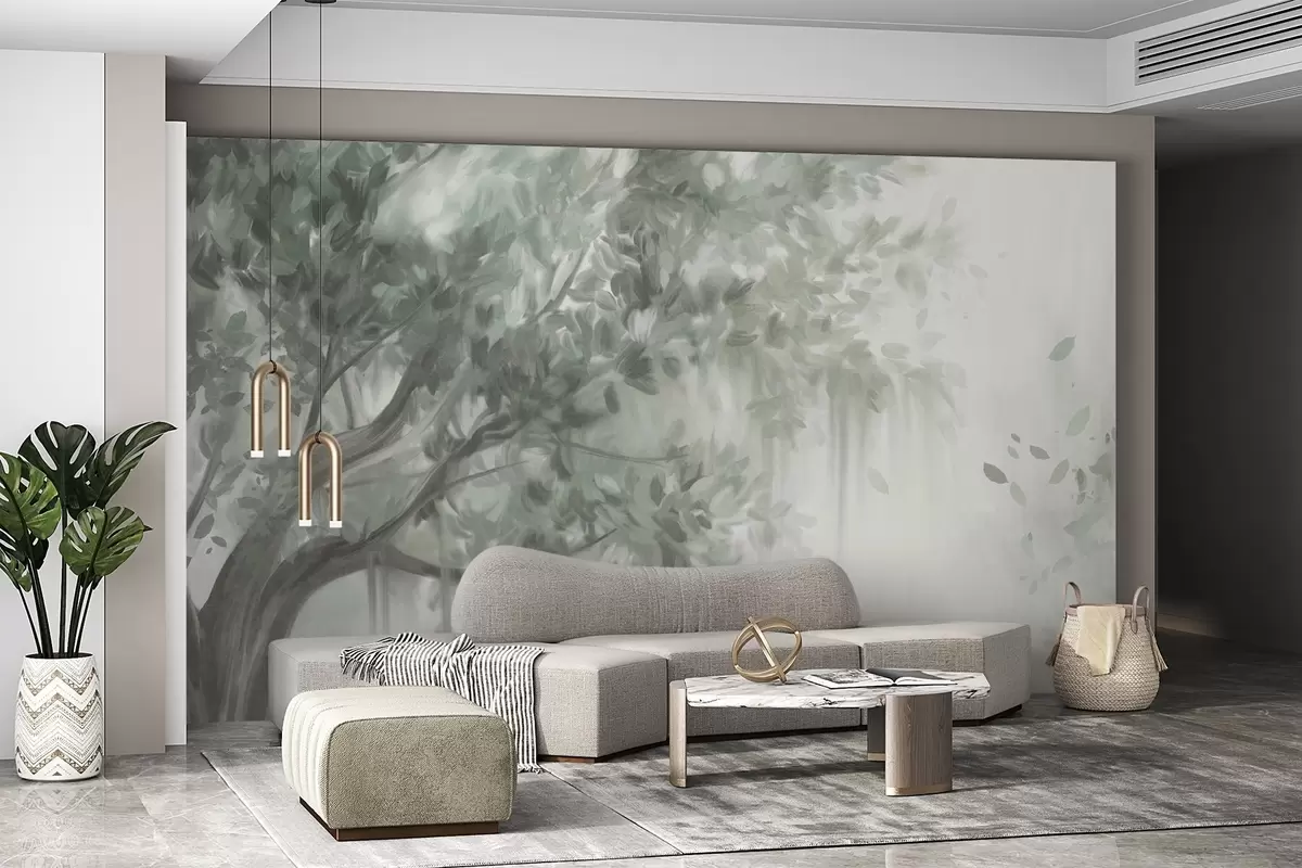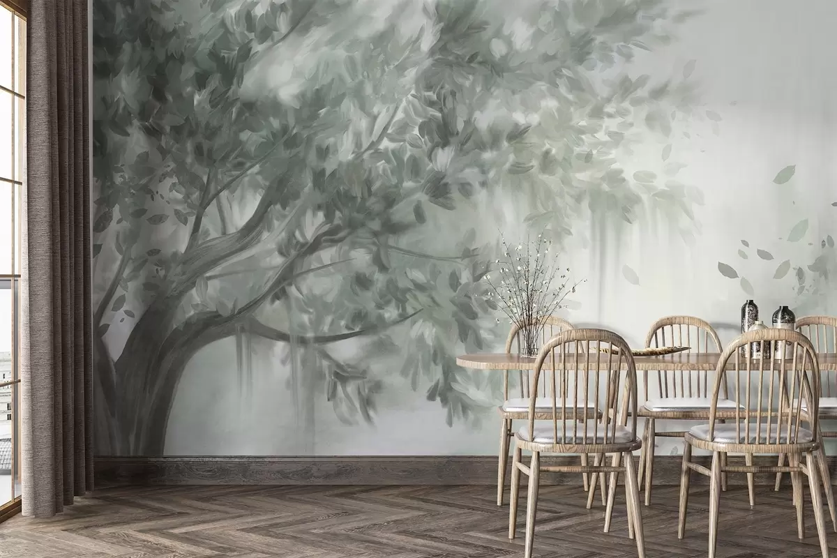 Fotobehang Getextureerde boom met groene bladeren en takken, met een zachte, wazige achtergrond N° w09650v1
