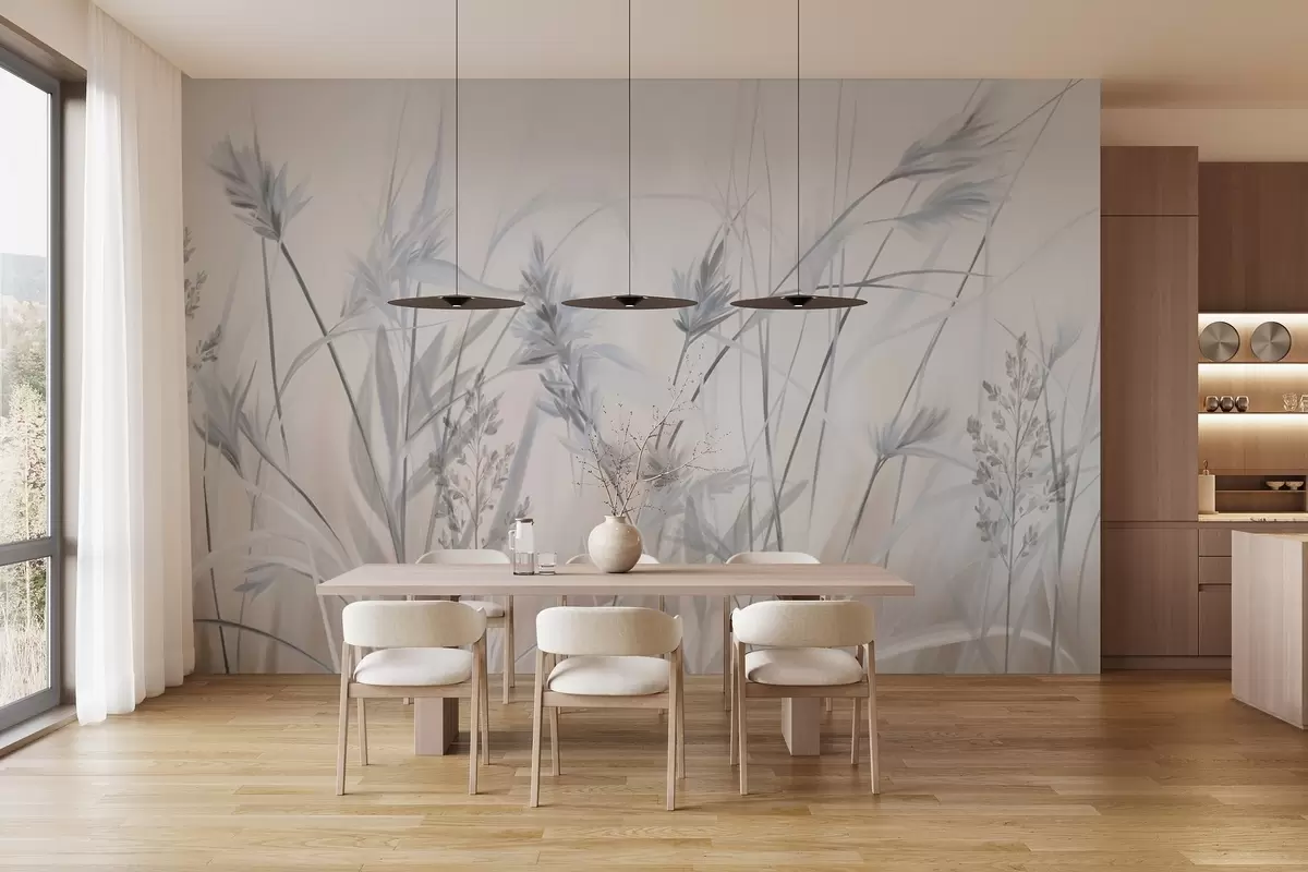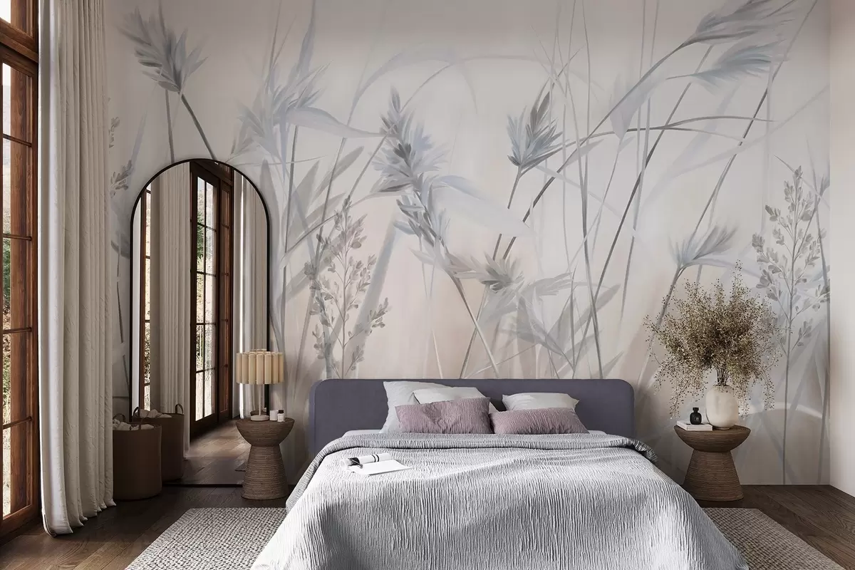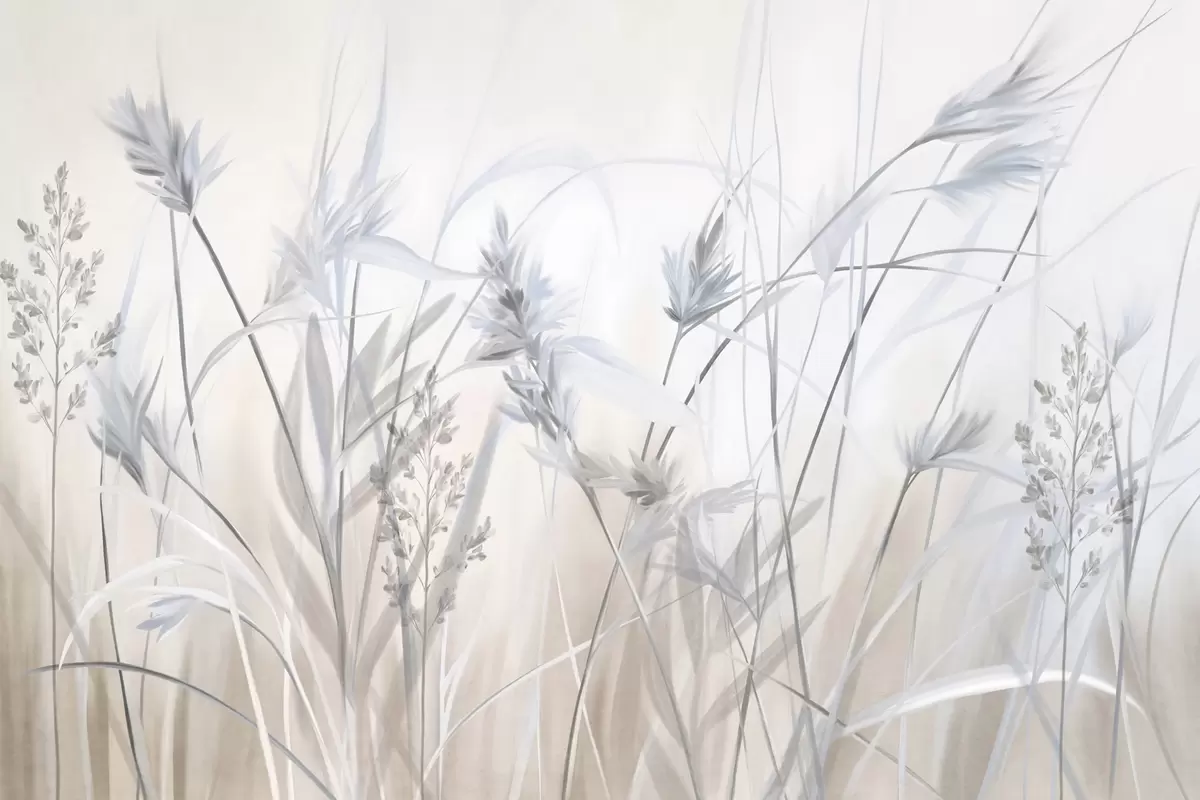 Fotobehang Hoge, droge grassprieten met pluizige toppen in gedempte tinten, zachte, wazige witte en beige achtergrond N° w09652v1