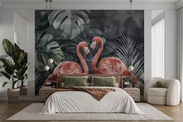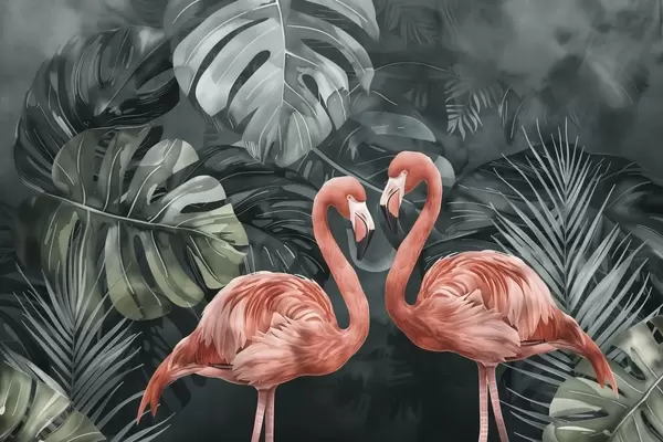 Fotobehang Een paar flamingo's tussen tropische planten N° w09687