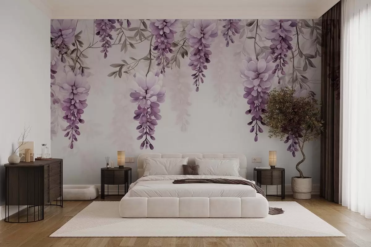 Fotobehang Delicate, grote lavendel takken aan de muur, imitatie aquarel N° w09690