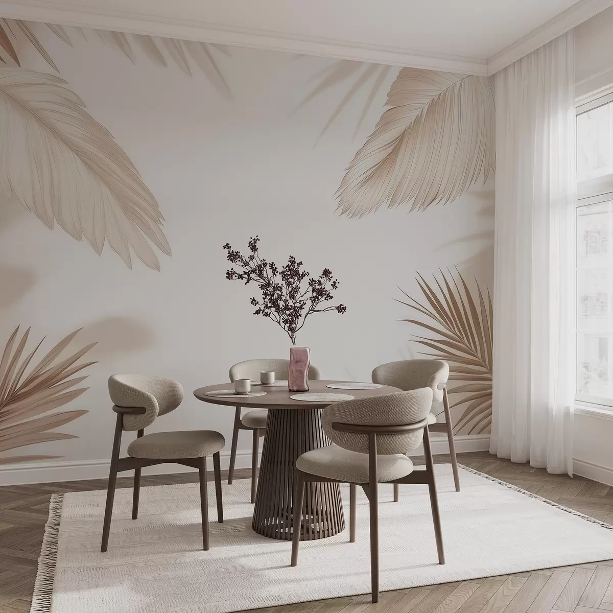 Fotobehang Beige tropisch decor met silhouetten van palmbladeren en zachte schaduwen N° w09714