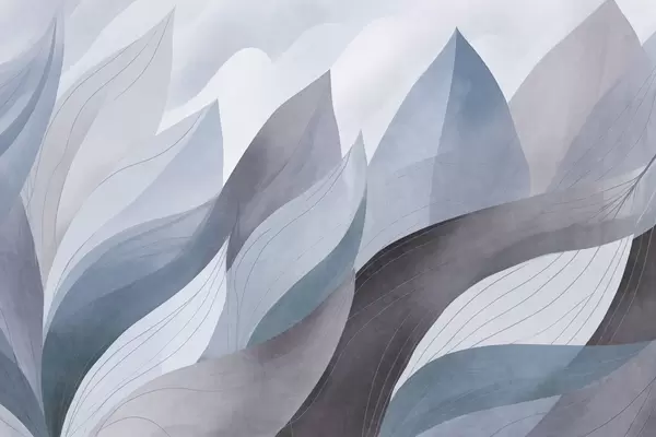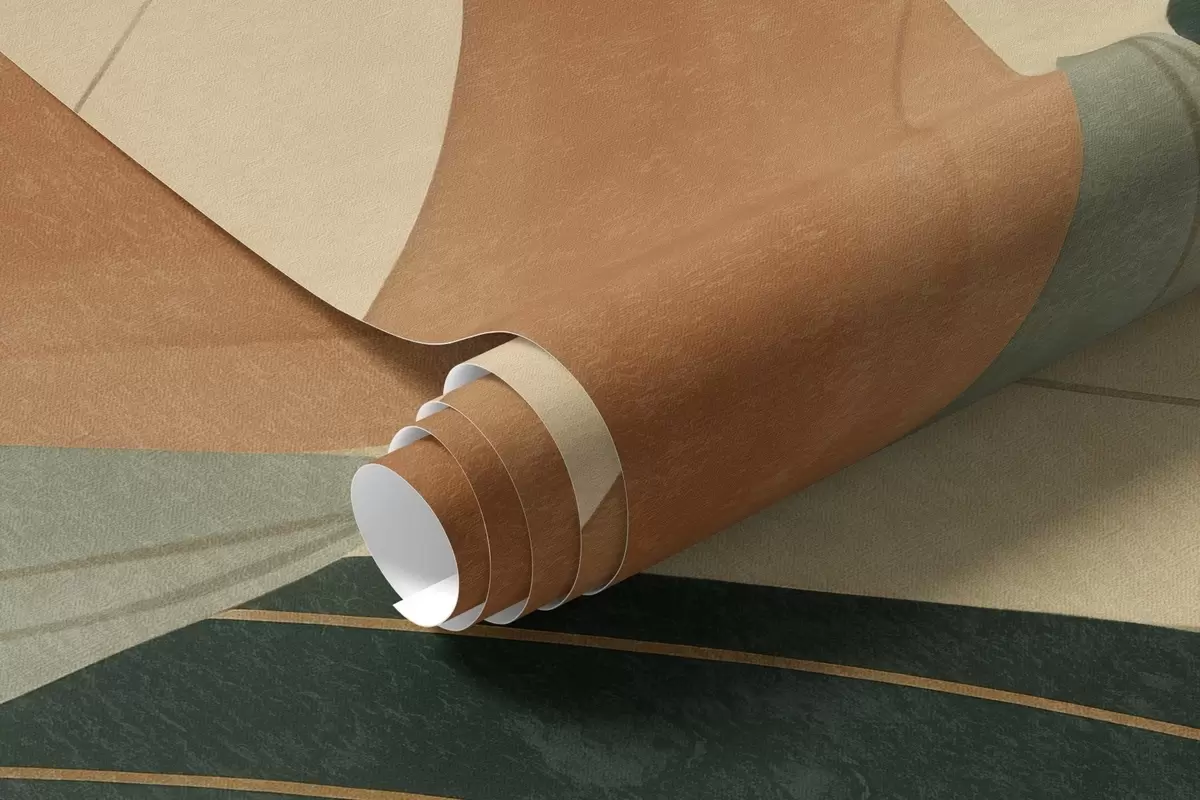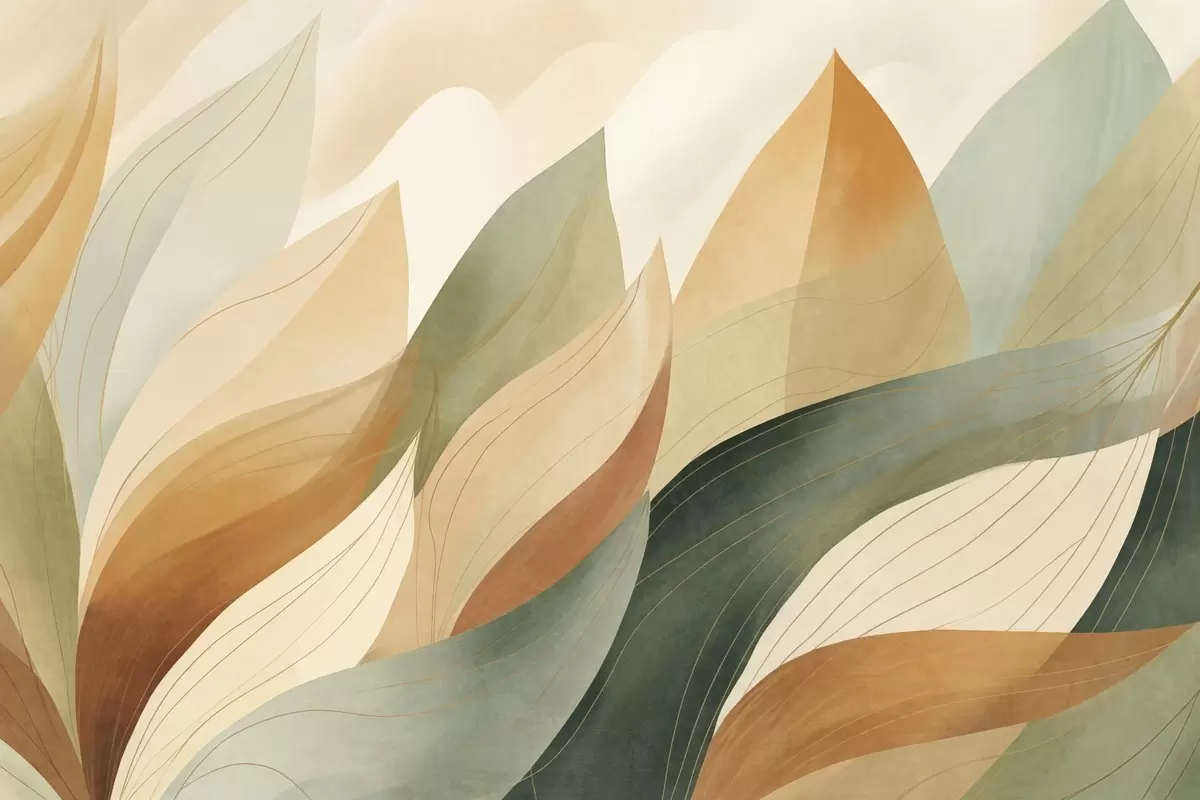 Fotobehang Abstracte bladeren, gedempte aardetinten van groen en oranje met delicate lijndetails, zachte aquareltextuur N° w09736