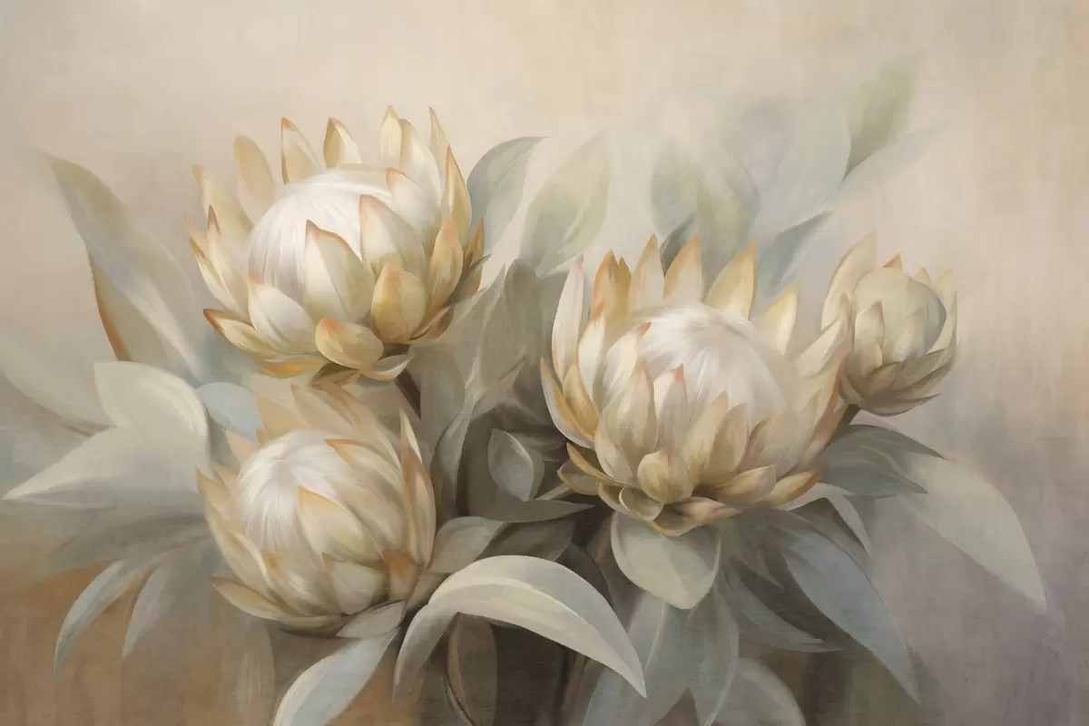 Fotobehang Getextureerde proteabloemen met groene bladeren en een zachte, wazige achtergrond N° w09738