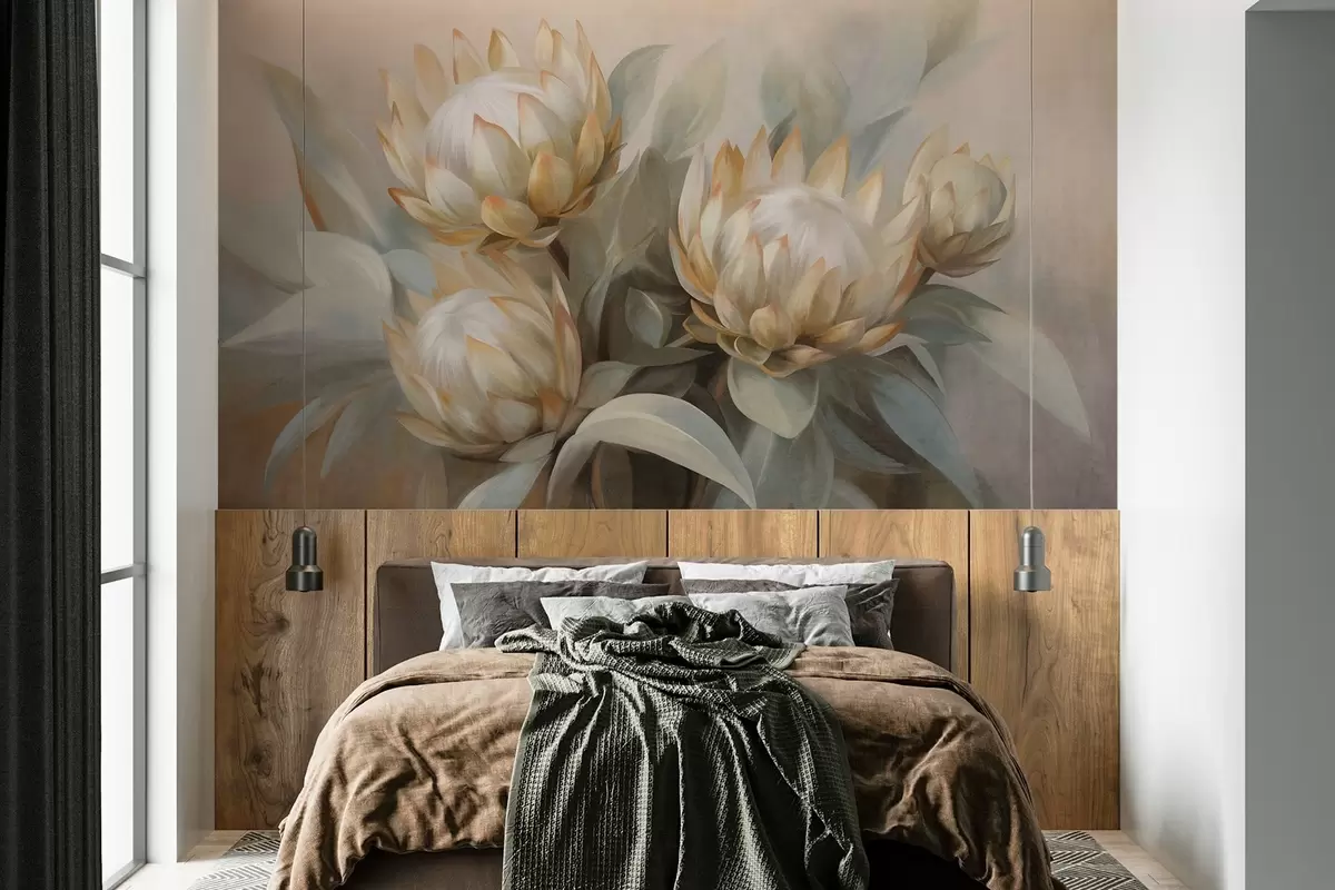 Fotobehang Getextureerde proteabloemen met groene bladeren en een zachte, wazige achtergrond w09738