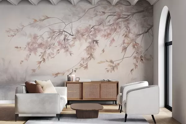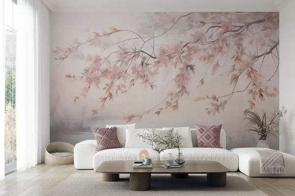 Fotobehang Getextureerd landschap met kersenbloesemtak, roze bladeren, zachte, mistige achtergrond N° w09743