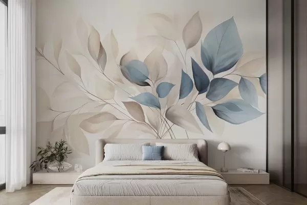 Fotobehang Abstracte doorschijnende bladeren in blauw-, beige- en crèmekleuren, kunst met textuur N° w09744