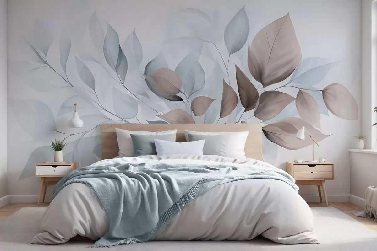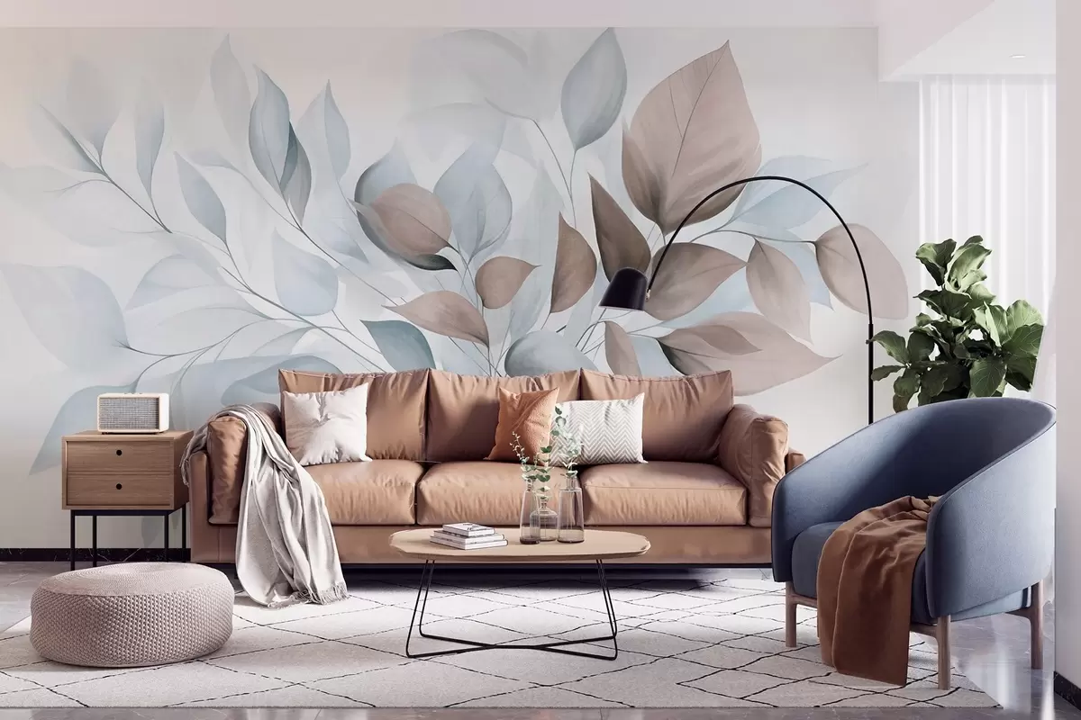 Fotobehang Abstracte doorschijnende bladeren in blauw-, beige- en bruintinten, kunst met textuur N° w09744v1