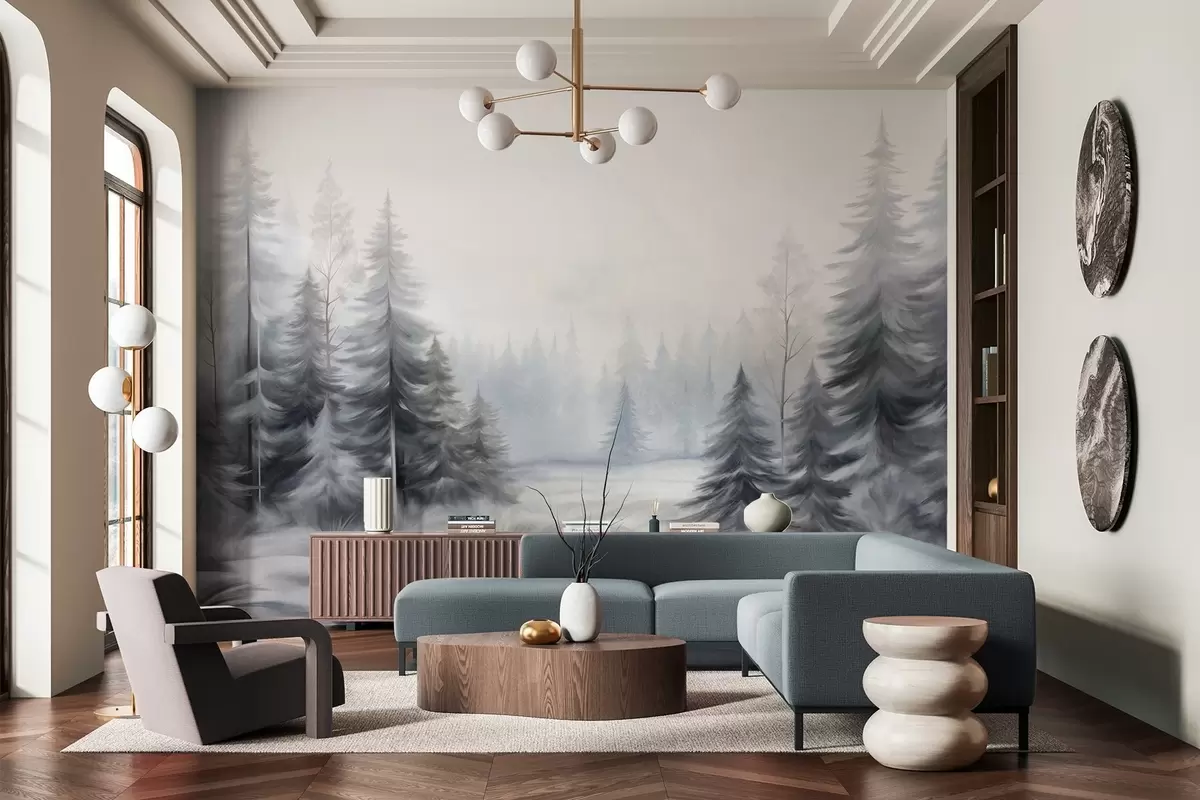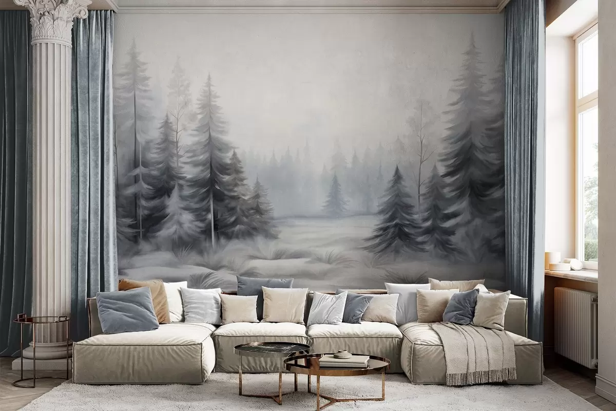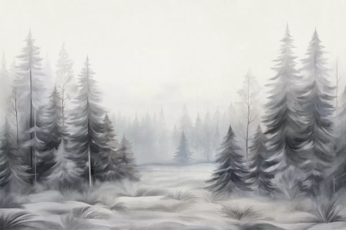 Fotobehang Getextureerde winterbomen in mist, in gedempte grijze en witte tinten N° w09745
