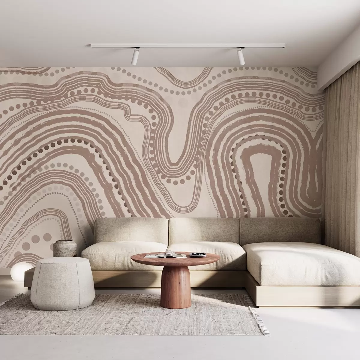 Fotobehang Abstracte bruine en beige golvende lijnen en stippen, moderne kunst met textuur N° w09747v1