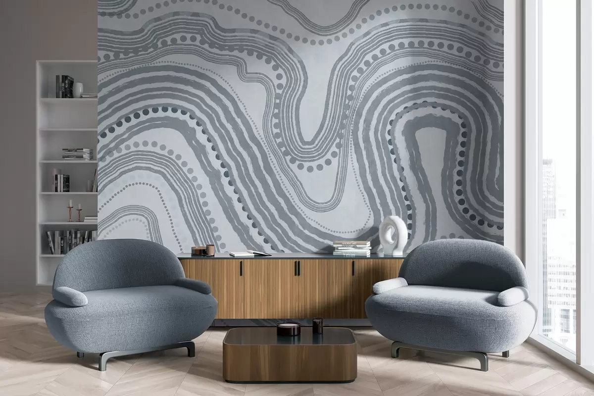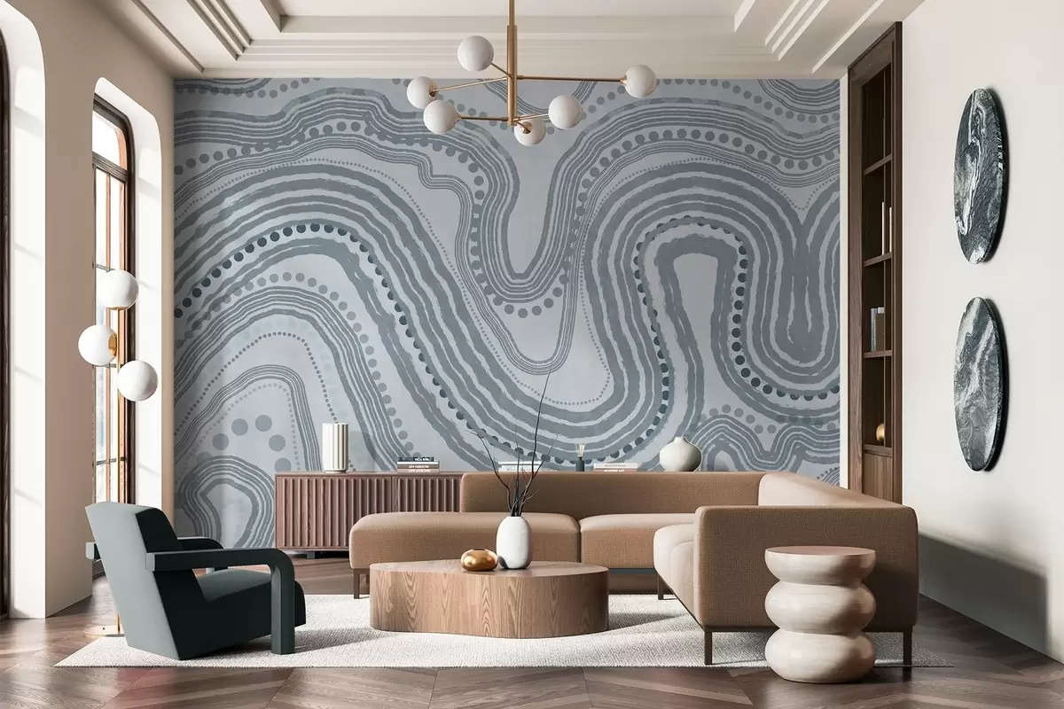 Fotobehang Abstracte blauwe golvende lijnen en stippen, moderne kunst met textuur N° w09747v3