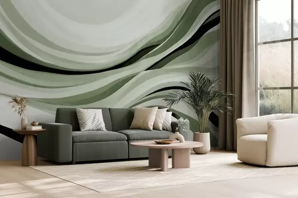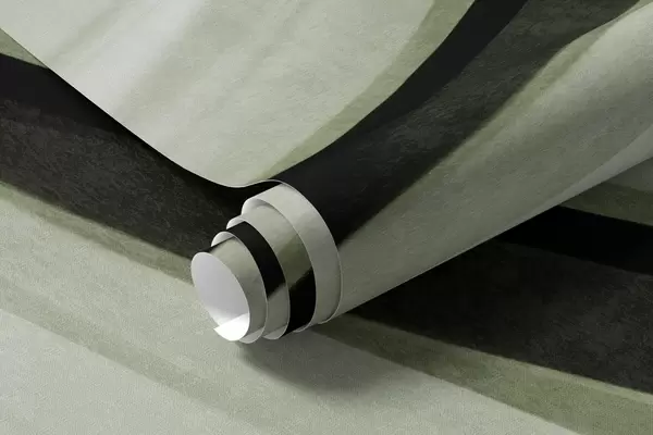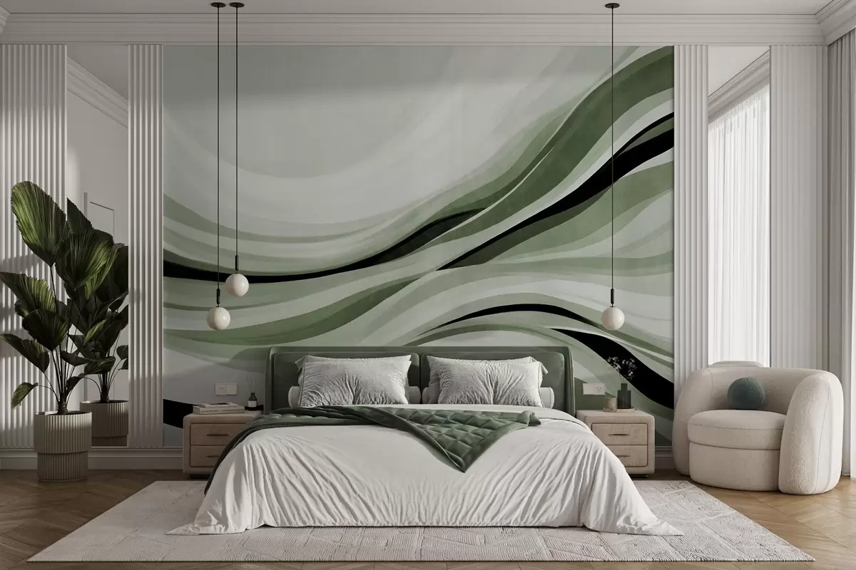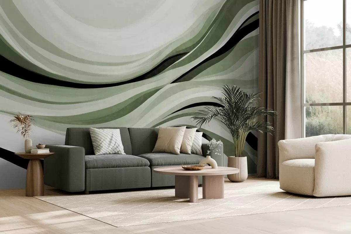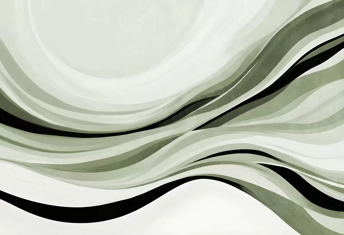 Fotobehang Abstracte golvende lijnen in groene en zwarte tinten tegen een lichte achtergrond, kunst met textuur N° w09748v1