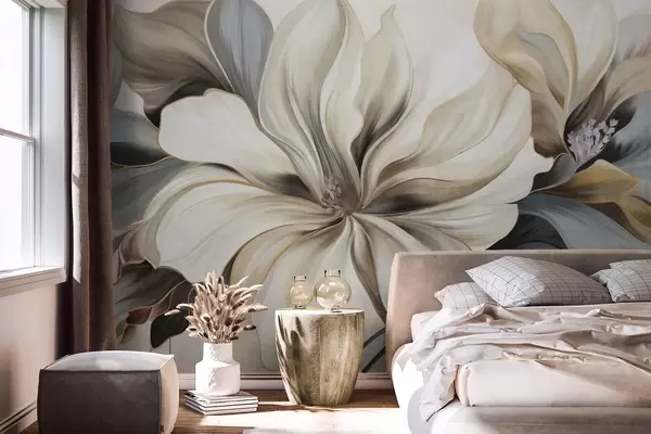 Fotobehang Grote, crèmekleurige magnoliabloemen met bruine en grijze bladeren, zachte verlichting, abstracte achtergrond N° w09749