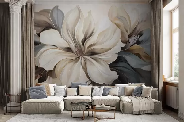 Fotobehang Grote, crèmekleurige magnoliabloemen met bruine en grijze bladeren, zachte verlichting, abstracte achtergrond N° w09749