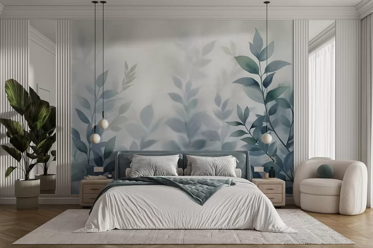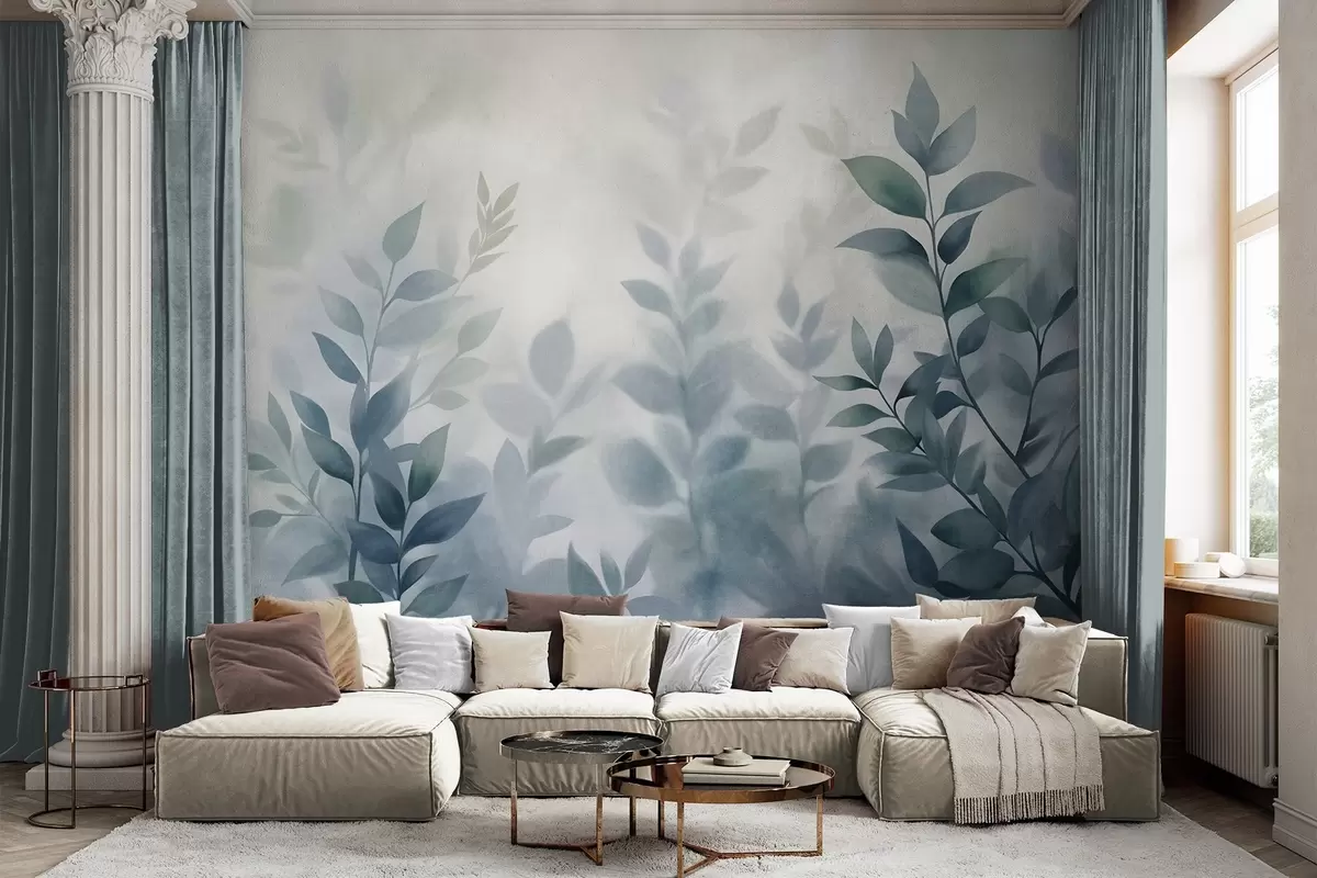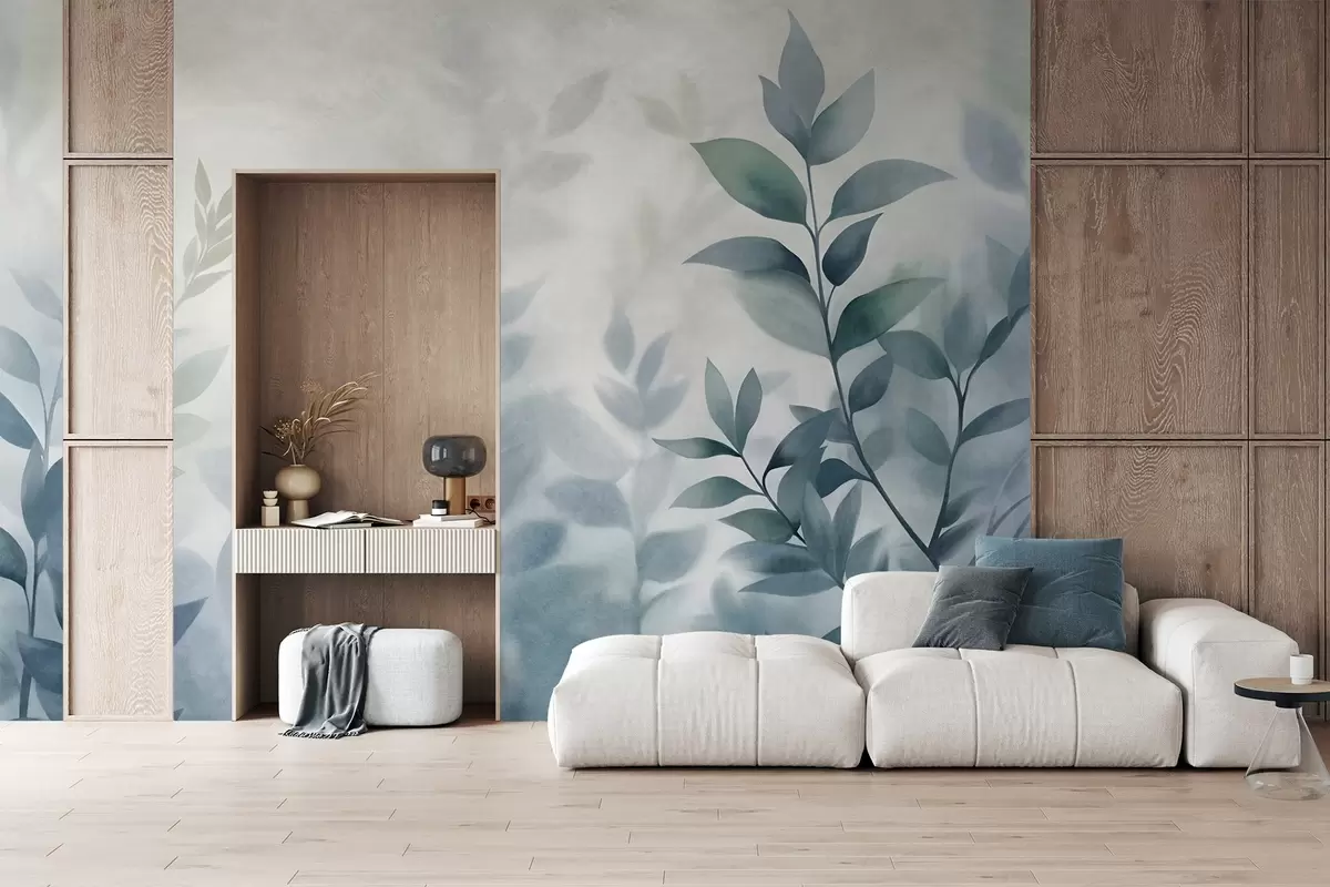 Fotobehang Delicate takken met gedempte blauwe bladeren, aquarelstijl, kunst met textuur N° w09750v1